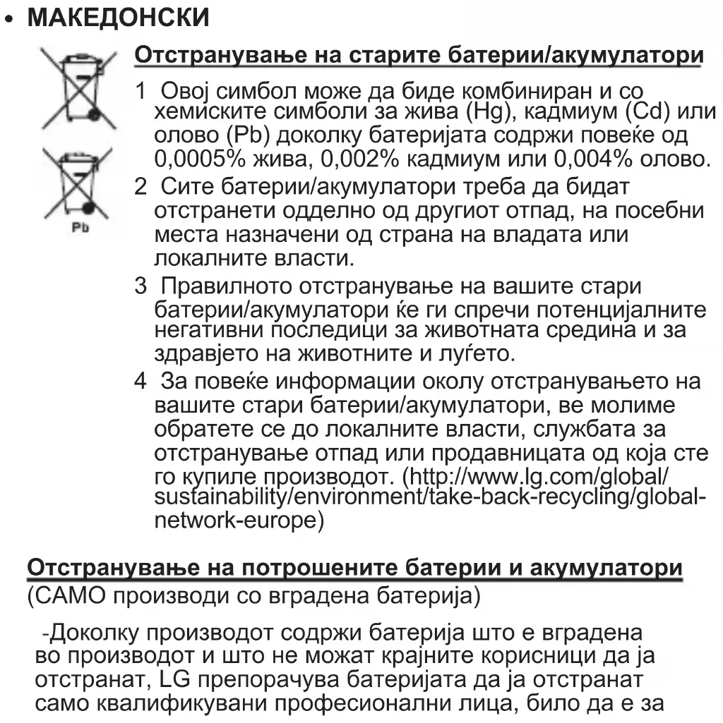 Отстранување на старите батерии/акумулатори 1 Овој симбол може да биде комбиниран и со хемиските симболи за жива (Hg), кадмиум (Cd) или олово (Pb) доколку батеријата содржи повеќе од 0,0005% жива, 0,002% кадмиум или 0,004% олово. 2 Сите батерии/акумулатори треба да бидат отстранети одделно од другиот отпад, на посебни места назначени од страна на владата или локалните власти. 3 Правилното отстранување на вашите стари батерии/акумулатори ќе ги спречи потенцијалните негативни последици за животната средина и за здравјето на животните и луѓето. 4 За повеќе информации околу отстранувањето на вашите стари батерии/акумулатори, ве молиме обратете се до локалните власти, службата за отстранување отпад или продавницата од која сте го купиле производот. (http://www.lg.com/global/ sustainability/environment/take-back-recycling/global- network-europe) Отстранување на потрошените батерии и акумулатори (САМО производи со вградена батерија) -Доколку производот содржи батерија што е вградена во производот и што не можат крајните корисници да ја отстранат, LG препорачува батеријата да ја отстранат само квалификувани професионални лица, било да е заменување или за рециклирање по истекот на животниот век на производот. За да спречат оштетување на производот и поради нивна сопствена безбедност, корисниците не треба да се обидуваат да ја отстрануваат батеријата и треба да ја контактираат линијата за помош при услуги на LG или други независни испорачувачи на услуги. -Отстранувањето на батеријата значи и расклопување на куќиштето на производот, исклучување на електричните кабли/контакти и внимателно вадење на батеријата со специјализиран алат. Доколку ви се потребни инструкциите за квалификувани професионални лица за тоа како да ја отстраните батеријата безбедно, посетете ја веб-страницата http://www.lge.com/global/sustainability/ environment/take-back-recycling.WEEE