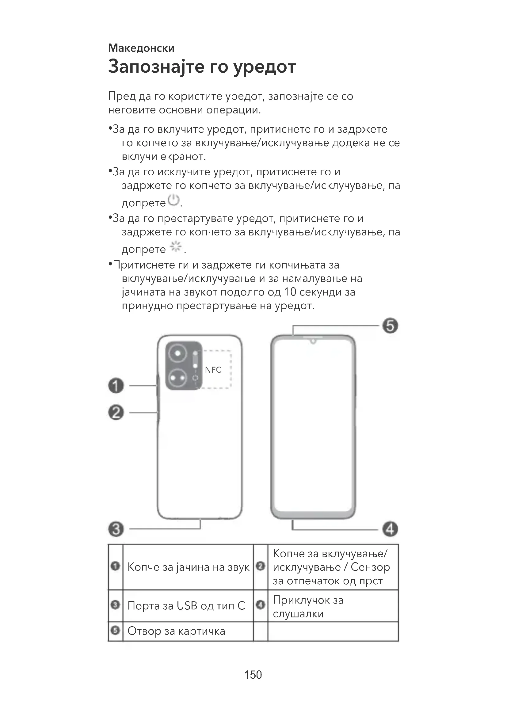 - Притиснете ги и задржете ги копчињата за вклучување/исклучување и за намалување на јачината на звукот подолго од 10 секунди за принудно престартување на уредот. NFC Копче за јачина на звук Kопче за вклучување/ исклучување / Сензор за отпечаток од прст Порта за USB од тип C Приклучок за