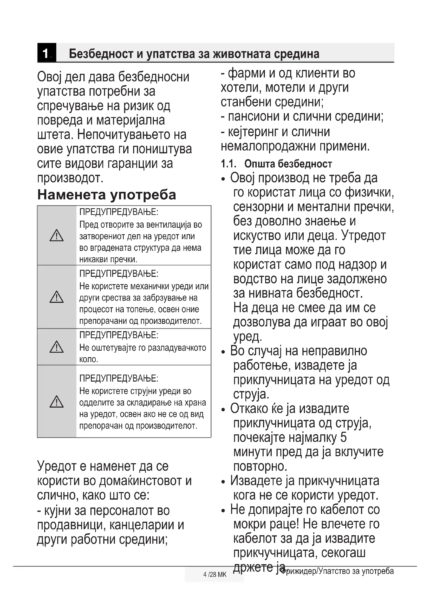 ПРЕДУПРЕДУВАЊЕ: Не користете струјни уреди во одделите за складирање на храна на уредот, освен ако не се од вид препорачан од производителот. Уредот е наменет да се користи во домаќинстовот и слично, како што се: - кујни за персоналот во продавници, канцеларии и други работни средини; - фарми и од клиенти во хотели, мотели и други станбени средини; - пансиони и слични средини; - кејтеринг и слични немалопродажни примени. 1.1. Општабезбедност