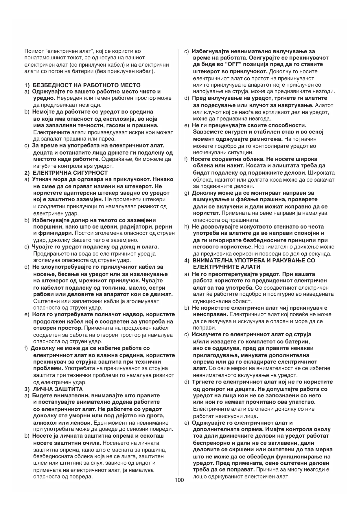 a) Бидете внимателни, внимавајте што правите и постапувајте внимателно додека работите со електричниот алат. Не работете со уредот доколку сте уморни или под дејство на дрога, алкохол или лекови. Еден момент на невнимание при употребата може да доведе до сеиозни повреди. b) Носете ја личната заштитна опрема и секогаш носете заштитни очила. Носењето на личната заштитна опрема, како што е маската за прашина, безбедносната облека која не се лизга, заштитен шлем или штитник за слух, зависно од видот и примената на електричниот алат, ја намалува опасноста од повреда.101