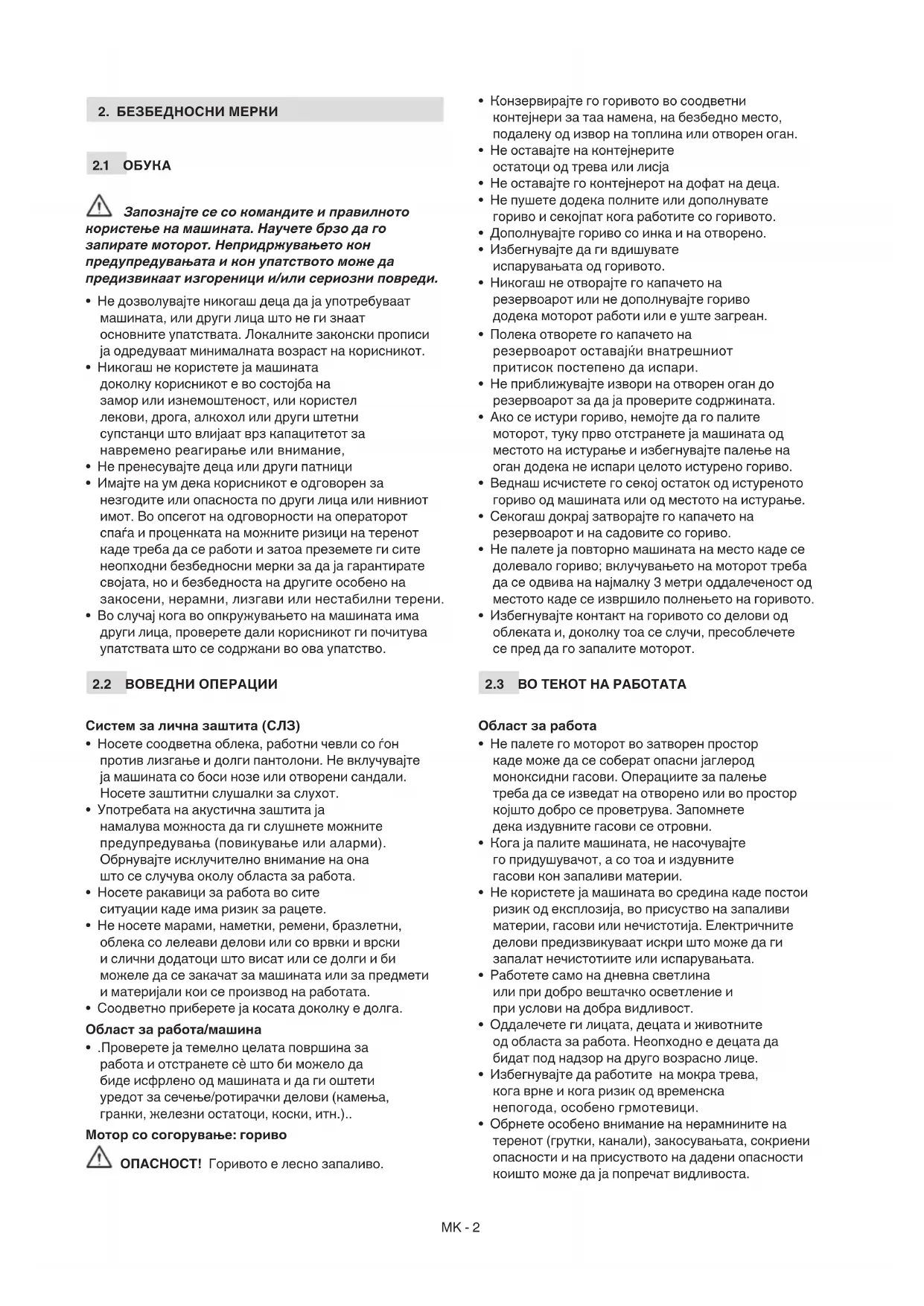 - Имајте на ум дека корисникот е одговорен за незгодите или опасноста по други лица или нивниот имот. Во опсегот на одговорности на операторот спаѓа и проценката на можните ризици на теренот каде треба да се работи и затоа преземете ги сите неопходни безбедносни мерки за да ја гарантирате својата, но и безбедноста на другите особено на закосени, нерамни, лизгави или нестабилни терени.