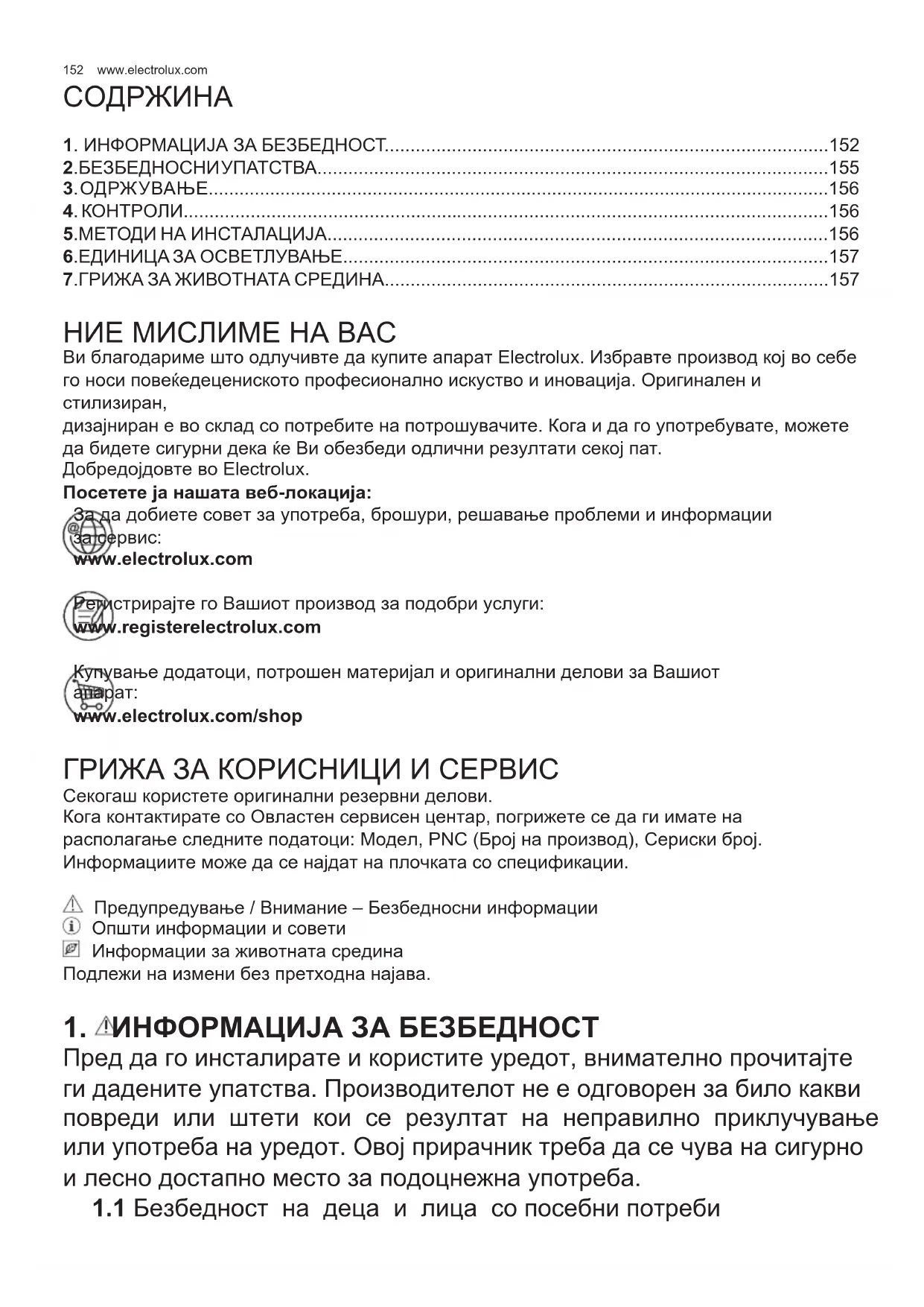 - 7.ГРИЖА ЗА ЖИВОТНАТА СРЕДИНА НИЕ МИСЛИМЕ НА ВАС Ви благодариме што одлучивте да купите апарат Electrolux. Избравте производ кој во себе го носи повеќедецениското професионално искуство и иновација. Оригинален и стилизиран, дизајниран е во склад со потребите на потрошувачите. Кога и да го употребувате, можете да бидете сигурни дека ќе Ви обезбеди одлични резултати секој пат. Добредојдовте во Electrolux. Посетете ја нашата веб-локација: За да добиете совет за употреба, брошури, решавање проблеми и информации p. 157