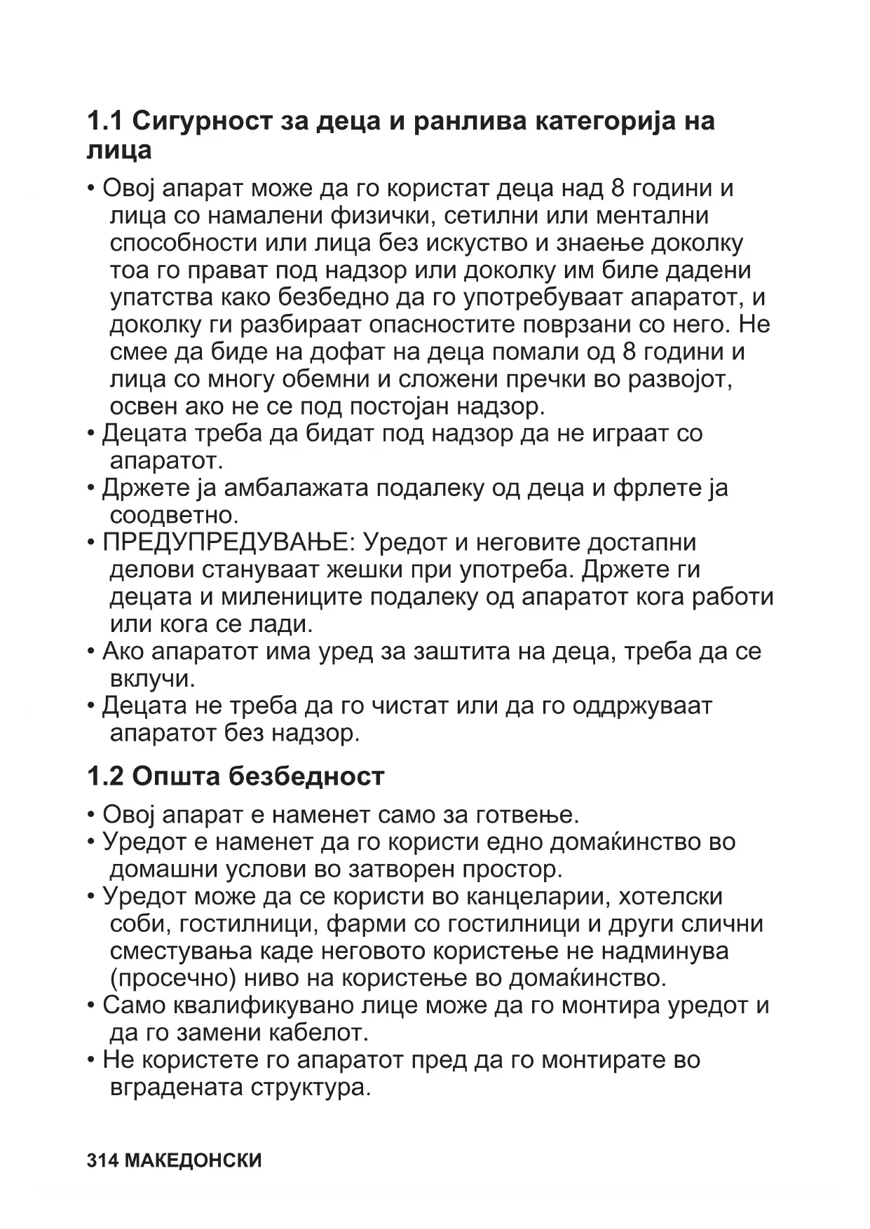 Пред монтирање и користење на апаратот, ве молиме внимателно да ги прочитате приложените упатства. Производителот не сноси одговорност за направена повреда или штета кои се резултат на неправилна монтажа или употреба. Секогаш чувајте ги упатствата на сигурно и безбедно место за подоцнежна употреба. МАКЕДОНСКИ 3131.1 Сигурност за деца и ранлива категорија на