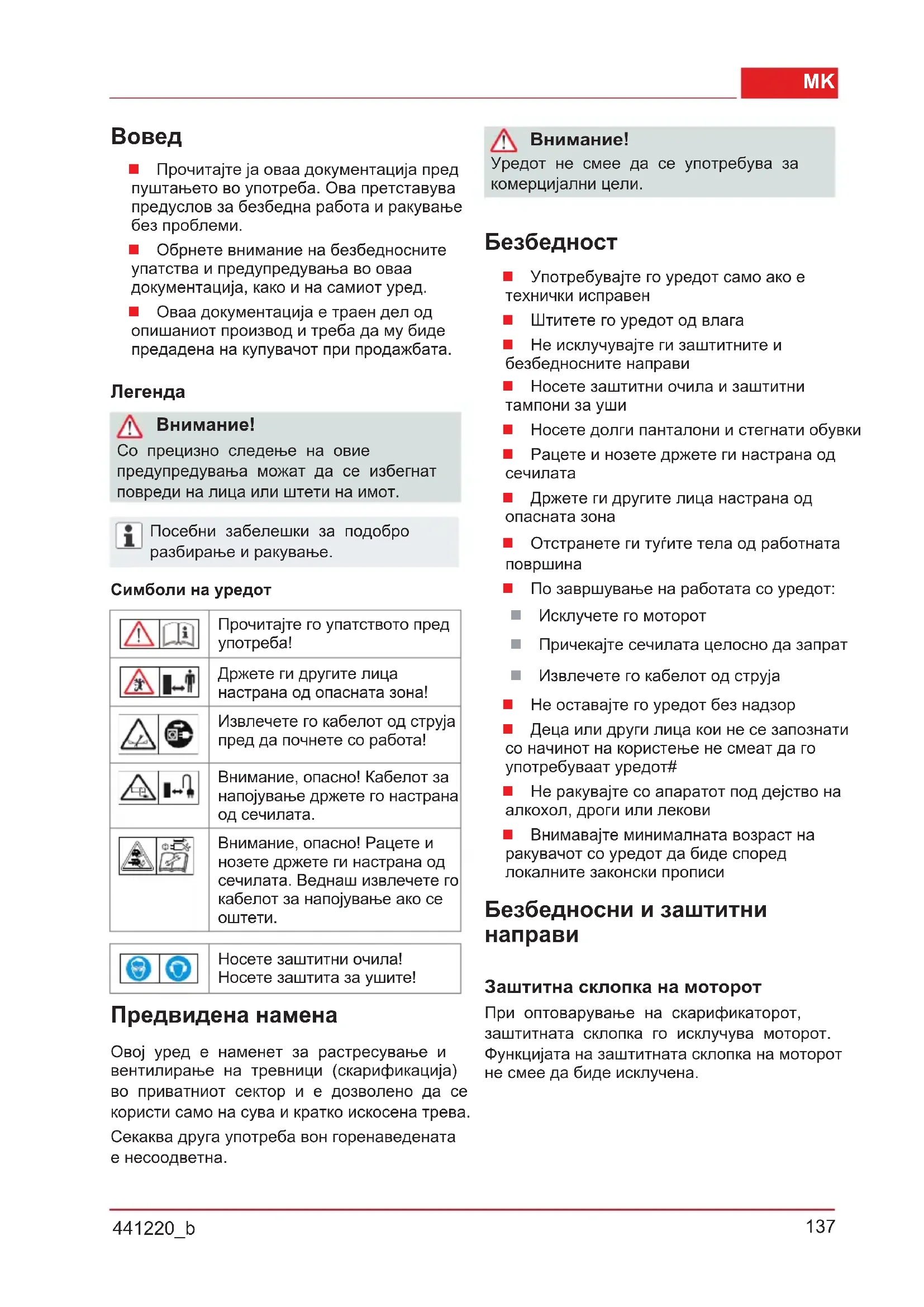 Носете заштитни очила! Носете заштита за ушите! Предвидена намена Овој уред е наменет за растресување и вентилирање на тревници (скарификација) во приватниот сектор и е дозволено да се користи само на сува и кратко искосена трева. Секаква друга употреба вон горенаведената е несоодветна.
