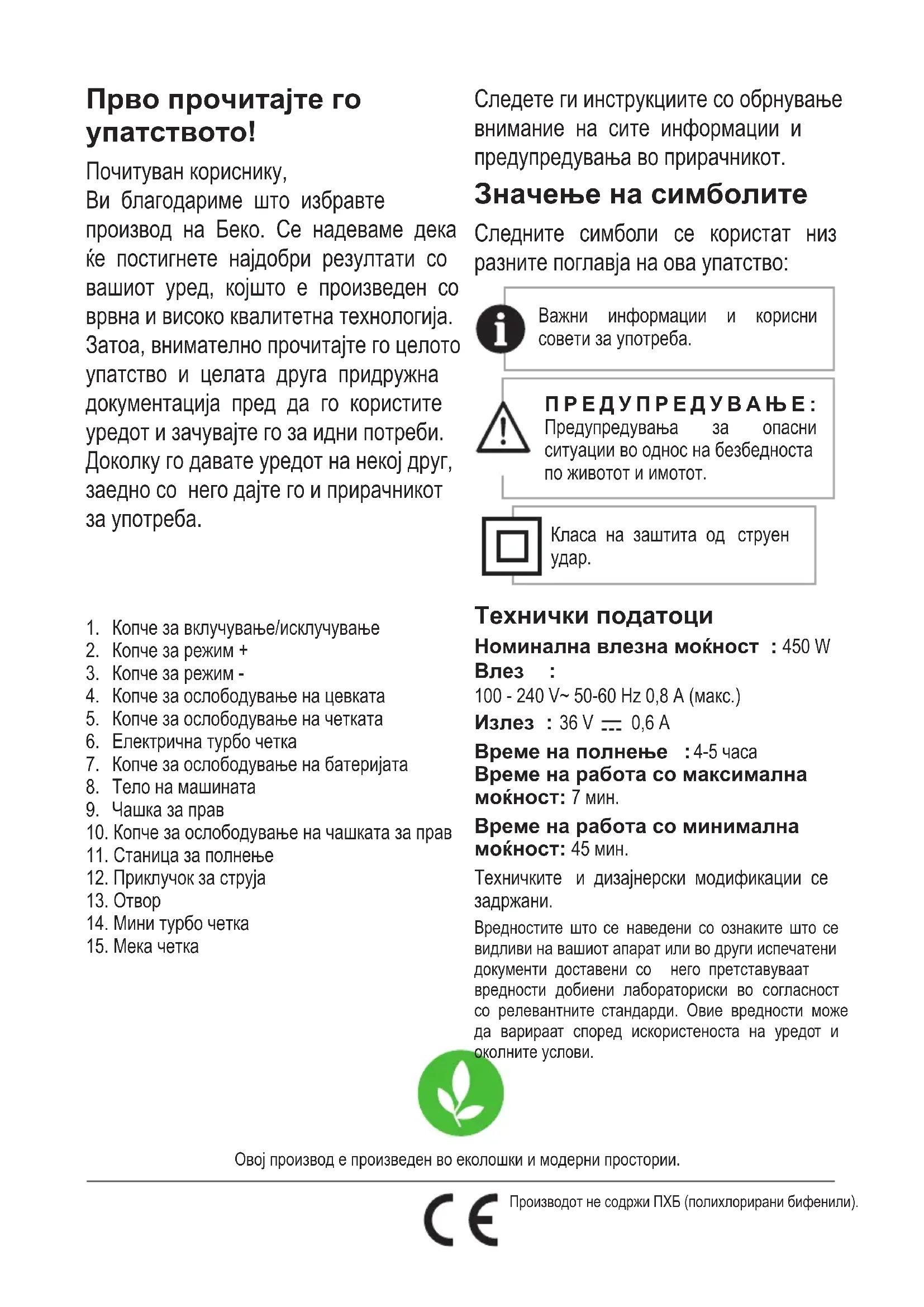 6 Otkrivanje i rešavanje problemaПрво прочитајте го упатството! Почитуван кориснику, Ви благодариме што избравте производ на Беко. Се надеваме дека ќе постигнете најдобри резултати со вашиот уред, којшто е произведен со врвна и високо квалитетна технологија. Затоа, внимателно прочитајте го целото упатство и целата друга придружна документација пред да го користите уредот и зачувајте го за идни потреби. Доколку го давате уредот на некој друг, заедно со него дајте го и прирачникот за употреба. Овој производ е произведен во еколошки и модерни простории. Производот не содржи ПХБ (полихлорирани бифенили). Следете ги инструкциите со обрнување внимание на сите информации и предупредувања во прирачникот. Значење на симболите Следните симболи се користат низ разните поглавја на ова упатство: Важни информации и корисни совети за употреба. ПРЕДУПРЕДУВАЊЕ: Предупредувања за опасни ситуации во однос на безбедноста по животот и имотот. Класа на заштита од струен