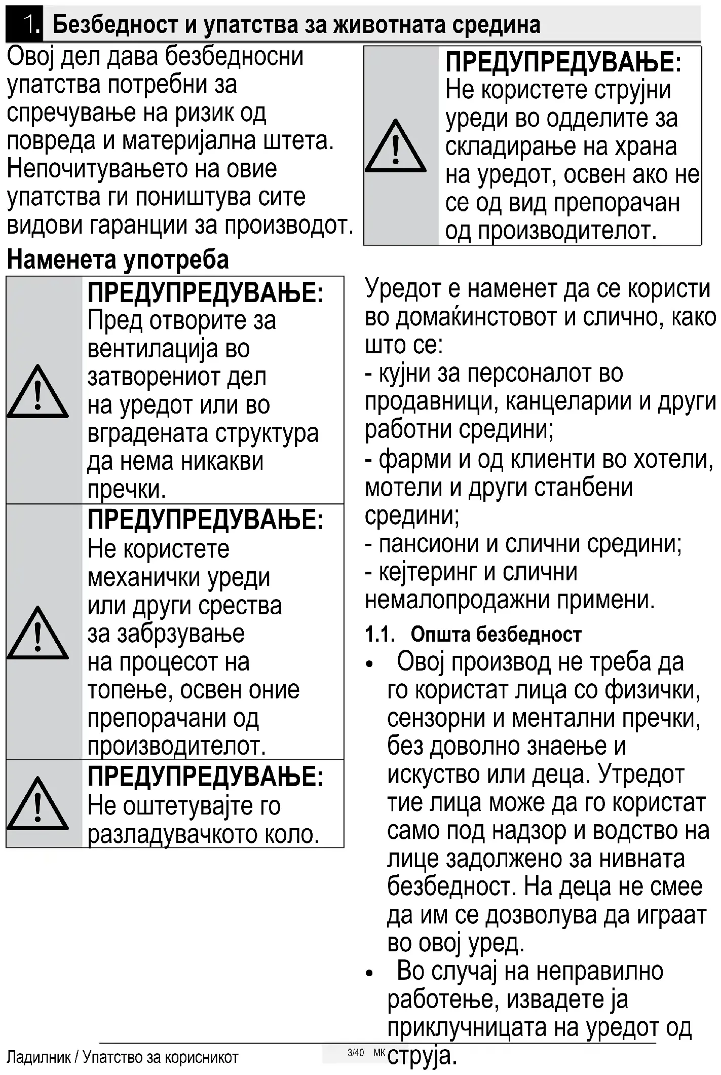 ПРЕДУПРЕДУВАЊЕ: Не користете струјни уреди во одделите за складирање на храна на уредот, освен ако не се од вид препорачан од производителот. Уредот е наменет да се користи во домаќинстовот и слично, како