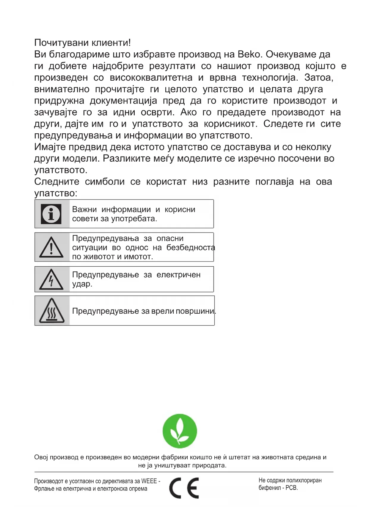 Важни упатства за безбедноста и животната средина ВНИМАНИЕ: Деловите што може да дофата се загреваат кога се користат со шпорети.