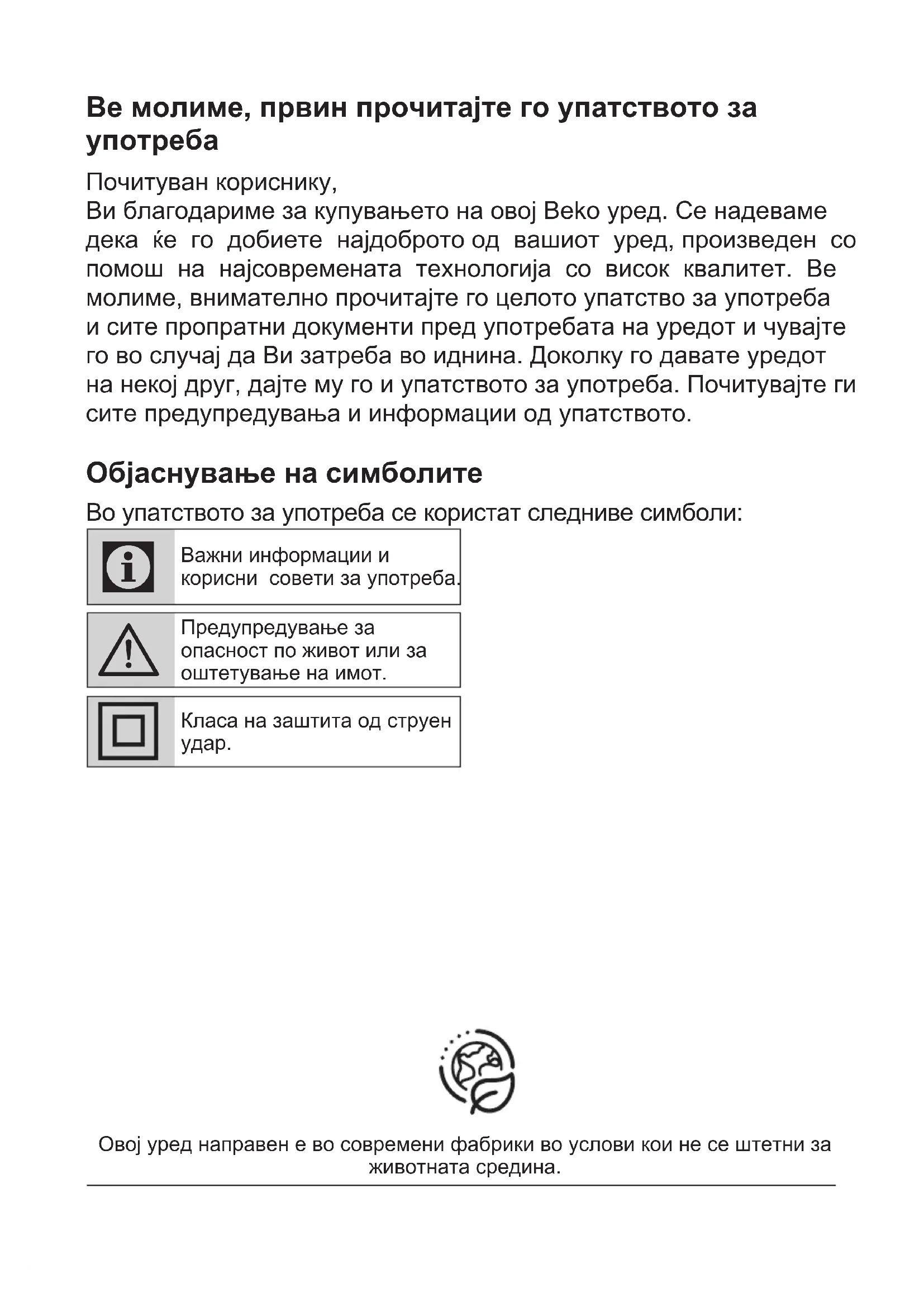 Почитуван кориснику, Ви благодариме за купувањето на овој Beko уред. Се надеваме дека ќе го добиете најдоброто од вашиот уред, произведен со помош на најсовремената технологија со висок квалитет. Ве молиме, внимателно прочитајте го целото упатство за употреба и сите пропратни документи пред употребата на уредот и чувајте го во случај да Ви затреба во иднина. Доколку го давате уредот на некој друг, дајте му го и упатството за употреба. Почитувајте ги сите предупредувања и информации од упатството. Oбјаснување на симболите Во упатството за употреба се користат следниве симболи: