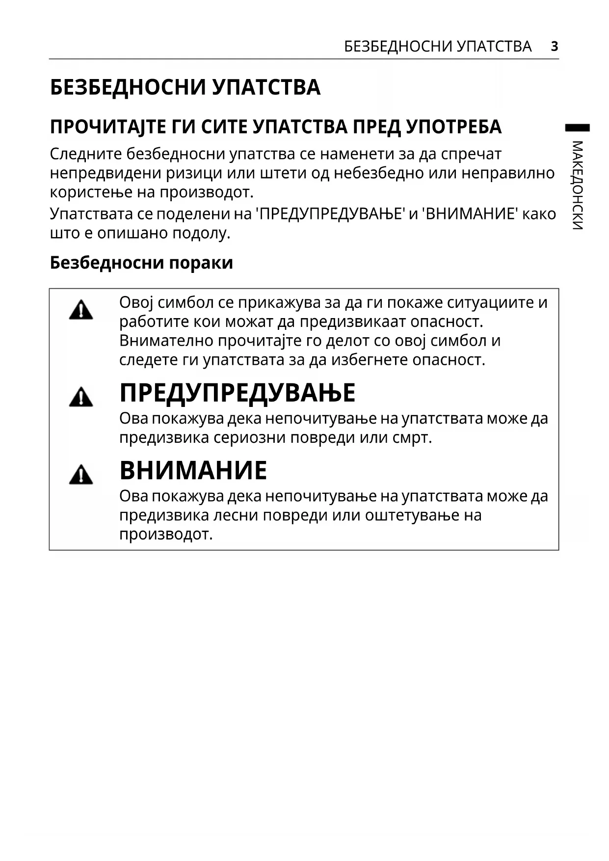 Чистење............................................................................................................39 РЕШАВАЊЕ ПРОБЛЕМИ Пред да го повикате сервисот.....................................................................443 БЕЗБЕДНОСНИ УПАТСТВАМАКЕДОНСКИ БЕЗБЕДНОСНИ УПАТСТВА ПРОЧИТАЈТЕ ГИ СИТЕ УПАТСТВА ПРЕД УПОТРЕБА Следните безбедносни упатства се наменети за да спречат непредвидени ризици или штети од небезбедно или неправилно користење на производот. Упатствата се поделени на 'ПРЕДУПРЕДУВАЊЕ' и 'ВНИМАНИЕ' како што е опишано подолу. Безбедносни пораки Овој симбол се прикажува за да ги покаже ситуациите и работите кои можат да предизвикаат опасност. Внимателно прочитајте го делот со овој симбол и следете ги упатствата за да избегнете опасност. ПРЕДУПРЕДУВАЊЕ Ова покажува дека непочитување на упатствата може да предизвика сериозни повреди или смрт.