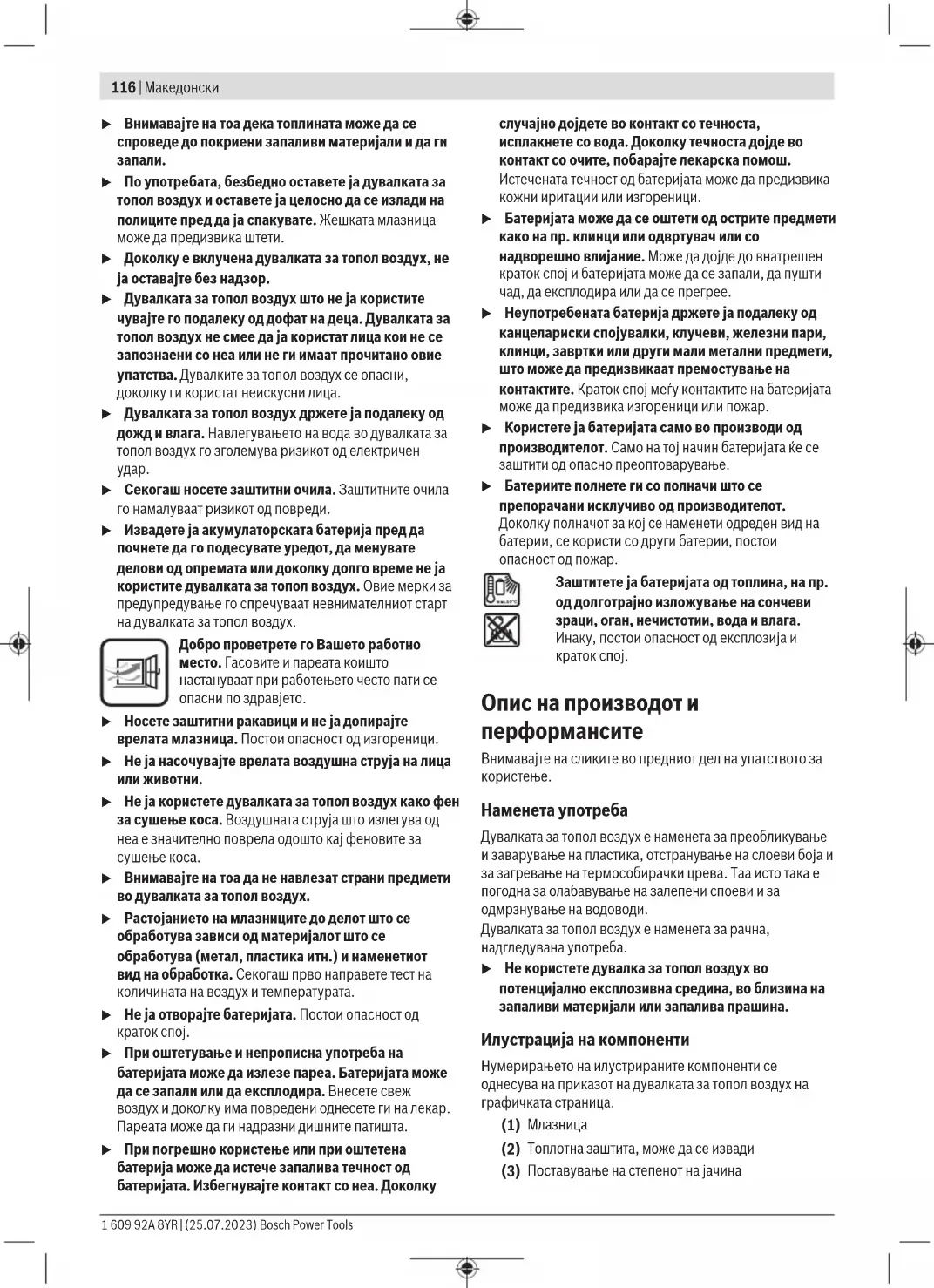 u Секогаш носете заштитни очила. Заштитните очила го намалуваат ризикот од повреди. u Извадете ја акумулаторската батерија пред да почнете да го подесувате уредот, да менувате делови од опремата или доколку долго време не ја користите дувалката за топол воздух. Овие мерки за предупредување го спречуваат невнимателниот старт на дувалката за топол воздух. Добро проветрете го Вашето работно место. Гасовите и пареата коишто настануваат при работењето често пати се опасни по здравјето. u Носете заштитни ракавици и не ја допирајте врелата млазница. Постои опасност од изгореници. u Не ја насочувајте врелата воздушна струја на лица или животни. u Не ја користете дувалката за топол воздух како фен за сушење коса. Воздушната струја што излегува од неа е значително поврела одошто кај феновите за сушење коса. u Внимавајте на тоа да не навлезат страни предмети во дувалката за топол воздух. u Растојанието на млазниците до делот што се обработува зависи од материјалот што се обработува (метал, пластика итн.) и наменетиот вид на обработка. Секогаш прво направете тест на количината на воздух и температурата. u Не ја отворајте батеријата. Постои опасност од краток спој. u При оштетување и непрописна употреба на батеријата може да излезе пареа. Батеријата може да се запали или да експлодира. Внесете свеж воздух и доколку има повредени однесете ги на лекар. Пареата може да ги надразни дишните патишта. u При погрешно користење или при оштетена батерија може да истече запалива течност од батеријата. Избегнувајте контакт со неа. Доколку случајно дојдете во контакт со течноста, исплакнете со вода. Доколку течноста дојде во контакт со очите, побарајте лекарска помош. Истечената течност од батеријата може да предизвика кожни иритации или изгореници. u Батеријата може да се оштети од острите предмети како на пр. клинци или одвртувач или со надворешно влијание. Може да дојде до внатрешен краток спој и батеријата може да се запали, да пушти чад, да експлодира или да се прегрее. u Неупотребената батерија држете ја подалеку од канцелариски спојувалки, клучеви, железни пари, клинци, завртки или други мали метални предмети, што може да предизвикаат премостување на контактите. Краток спој меѓу контактите на батеријата може да предизвика изгореници или пожар. u Користете ја батеријата само во производи од производителот. Само на тој начин батеријата ќе се заштити од опасно преоптоварување. u Батериите полнете ги со полначи што се препорачани исклучиво од производителот. Доколку полначот за кој се наменети одреден вид на батерии, се користи со други батерии, постои опасност од пожар. Заштитете ја батеријата од топлина, на пр. од долготрајно изложување на сончеви зраци, оган, нечистотии, вода и влага. Инаку, постои опасност од експлозија и краток спој. Опис на производот и перформансите Внимавајте на сликите во предниот дел на упатството за