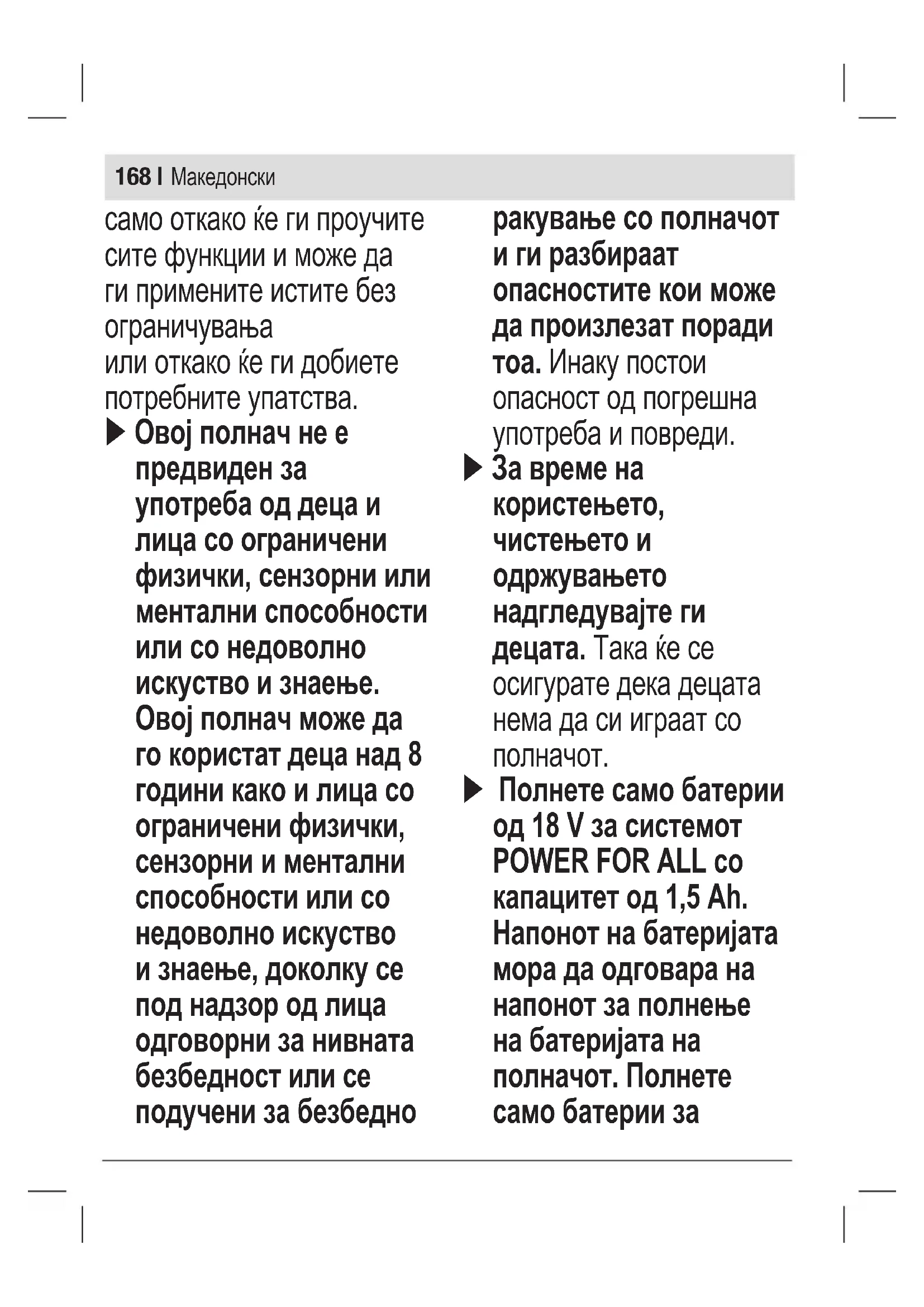 Користете го полначот Македонски168 | само откако ќе ги проучите сите функции и може да ги примените истите без ограничувања или откако ќе ги добиете потребните упатства. u Овој полнач не е предвиден за употреба од деца и лица со ограничени физички, сензорни или ментални способности или со недоволно искуство и знаење. Овој полнач може да го користат деца над 8 години како и лица со ограничени физички, сензорни и ментални способности или со недоволно искуство и знаење, доколку се под надзор од лица одговорни за нивната безбедност или се подучени за безбедно ракување со полначот и ги разбираат опасностите кои може да произлезат поради тоа. Инаку постои опасност од погрешна употреба и повреди. u За време на користењето, чистењето и одржувањето надгледувајте ги децата. Така ќе се осигурате дека децата нема да си играат со