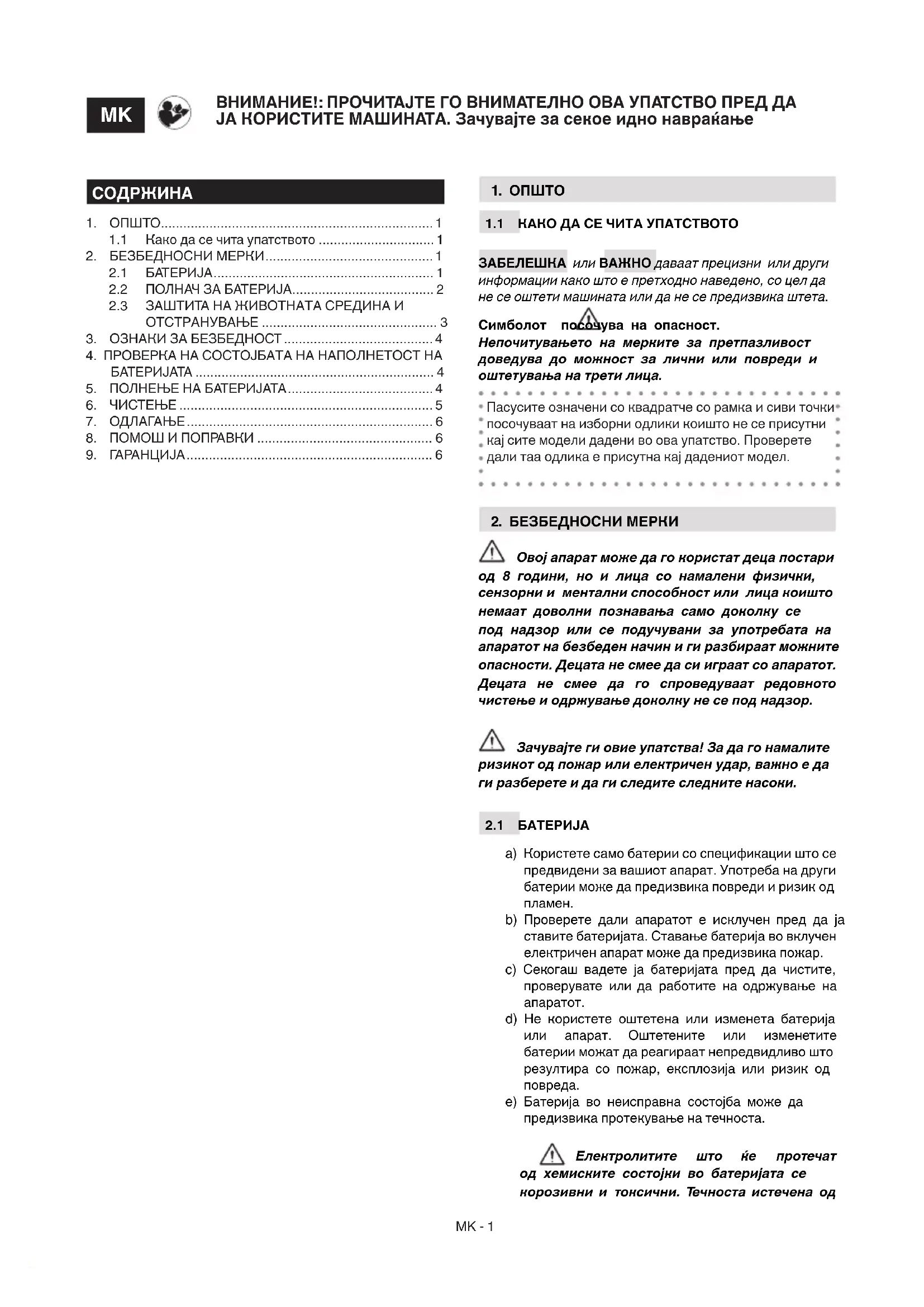 Батеријата / полнач - УПАТСТВА ЗА УПОТРЕБА ВНИМАНИЕ: прочитајте го внимателно ова упатство пред да ја користите машината.