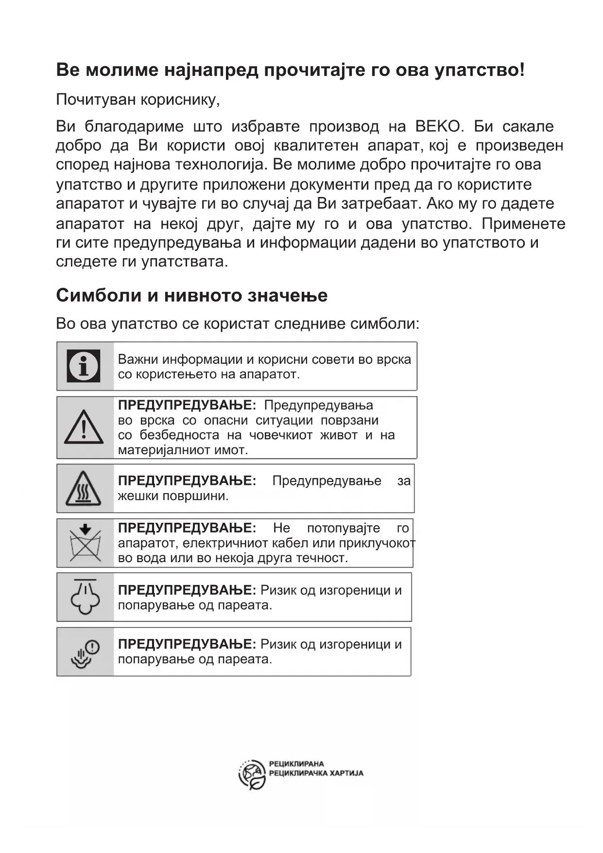 ПРЕДУПРЕДУВАЊЕ: Предупредувања во врска со опасни ситуации поврзани со безбедноста на човечкиот живот и на материјалниот имот. ПРЕДУПРЕДУВАЊЕ: Предупредување за жешки површини. ПРЕДУПРЕДУВАЊЕ: Не потопувајте го апаратот, електричниот кабел или приклучокот во вода или во некоја друга течност. ПРЕДУПРЕДУВАЊЕ: Ризик од изгореници и попарување од пареата. ПРЕДУПРЕДУВАЊЕ: Ризик од изгореници и попарување од пареата.188 / MK Пегла со генератор на пареа / Упатство за употреба Овој дел содржи упатства за безбедноста за да се спречат опасности што можат да водат до физички повреди или до оштетување на материјалниот имот. Ако не ги следите овие упатства, гаранцијата ќе изгуби важност. 1.1. Општа