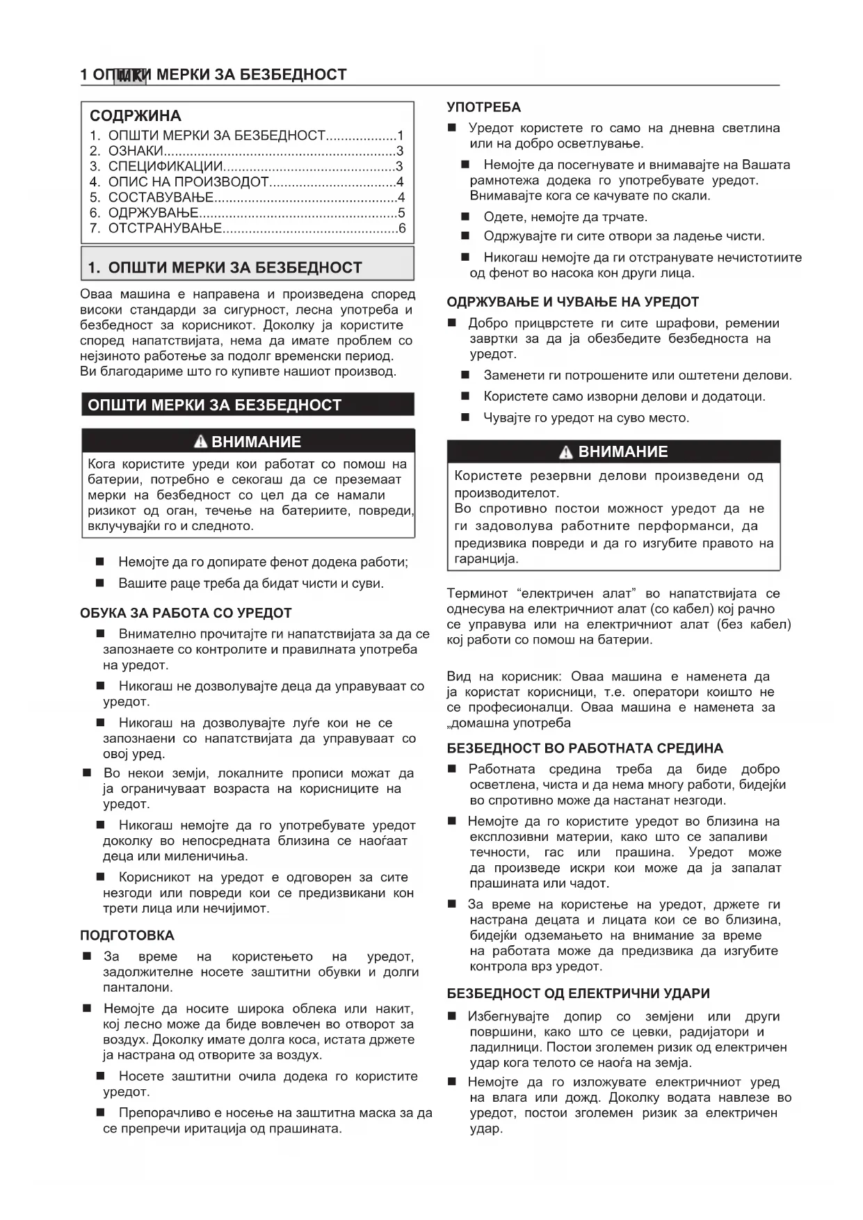 Оваа машина е направена и произведена според високи стандарди за сигурност, лесна употреба и безбедност за корисникот. Доколку ја користите според напатствијата, нема да имате проблем со нејзиното работење за подолг временски период. Ви благодариме што го купивте нашиот производ. ОПШТИ МЕРКИ ЗА БЕЗБЕДНОСТ