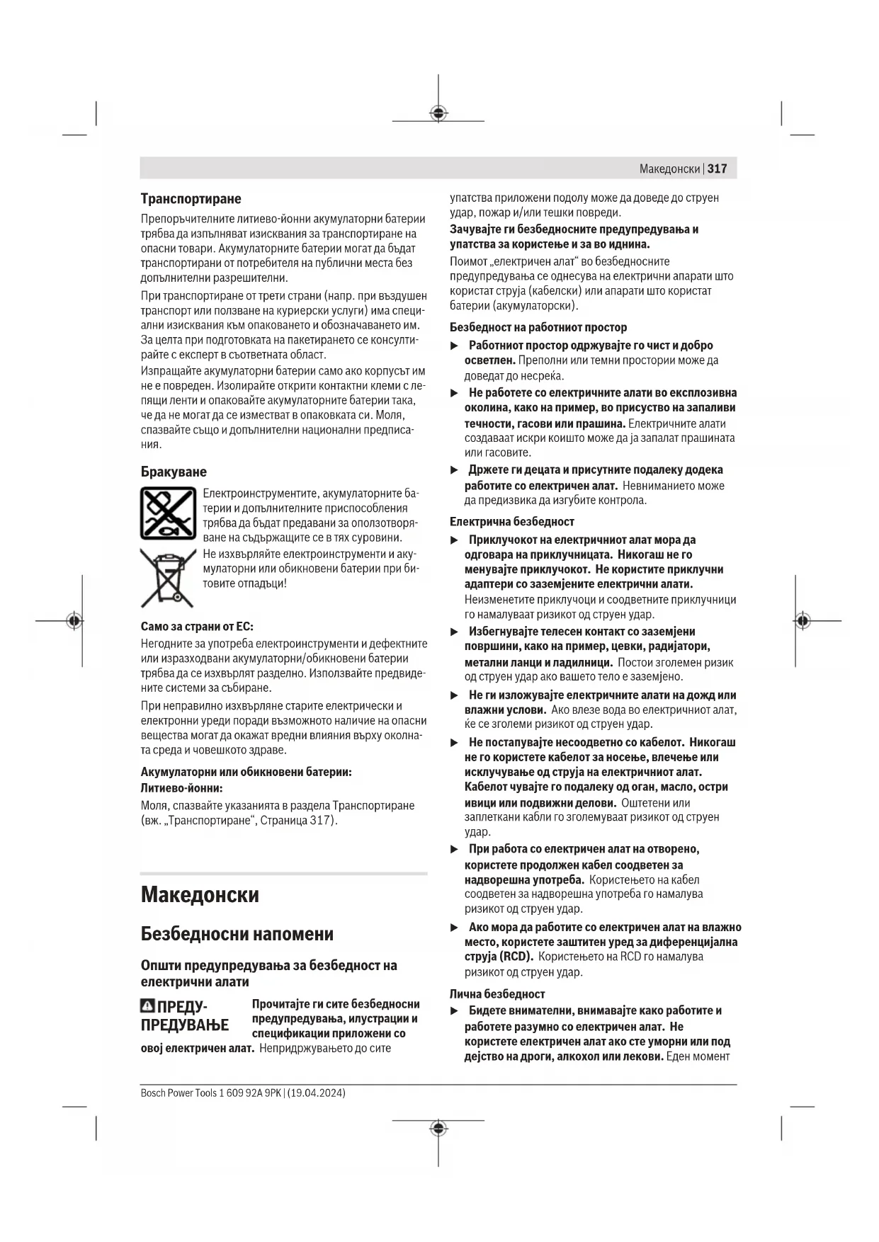 u При работа со електричен алат на отворено, користете продолжен кабел соодветен за надворешна употреба. Користењето на кабел соодветен за надворешна употреба го намалува ризикот од струен удар. u Ако мора да работите со електричен алат на влажно место, користете заштитен уред за диференцијална струја (RCD). Користењето на RCD го намалува ризикот од струен удар. Лична безбедност u Бидете внимателни, внимавајте како работите и работете разумно со електричен алат. Не користете електричен алат ако сте уморни или под дејство на дроги, алкохол или лекови. Еден момент Bosch Power Tools 1 609 92A 9PK | (19.04.2024)318 | Македонски на невнимание додека работите со електричните алати може да доведе до сериозна лична повреда. u Користете лична заштитна опрема. Секогаш носете заштита за очи. Заштитната опрема, како на пр., маска за прашина, безбедносни чевли коишто не се лизгаат, шлем или заштита за уши, коишто се користат за соодветни услови, ќе доведат до намалување на лични повреди. u Спречете ненамерно активирање. Проверете дали прекинувачот е исклучен пред да го вклучите во струја и/или со сетот на батерии, пред да го земете или носите алатот. Носење на електричните алати со прстот позициониран на прекинувачот или вклучување во струја на електричните алати чијшто прекинувачот е вклучен, може да предизвика несреќа. u Отстранете каков било клуч за регулирање или француски клуч пред да го вклучите електричниот алат. Француски клуч или клуч прикачен за ротирачкиот дел на електричниот алат може да доведе до лична повреда. u Не ги пречекорувајте ограничувањата. Постојано одржувајте соодветна положба и рамнотежа. Ова овозможува подобра контрола на електричниот алат во непредвидливи ситуации. u Облечете се соодветно. Не носете широка облека и накит. Косата и алиштата треба да бидат подалеку од подвижните делови. Широката облека, накитот или долгата коса може да се закачат за подвижните