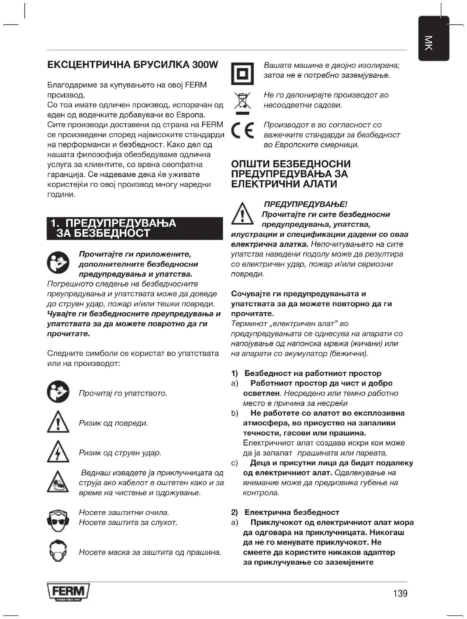 Следнитесимболисекористатвоупатствата илинапроизводот: Прочитај го упатството. Ризик од повреди. Ризик од струен удар. Веднаш извадете ја приклучницата од струја ако кабелот е оштетен како и за време на чистење и одржување. Носете заштитни очила. Носете заштита за слухот. Носете маска за заштита од прашина. Вашата машина е двојно изолирана; затоа не е потребно заземјување. Не го депонирајте производот во несоодветни садови. Производот е во согласност со важечките стандарди за безбедност во Европските смерници. ОПШТИ БЕЗБЕДНОСНИ ПРЕДУПРЕДУВАЊА ЗА ЕЛЕКТРИЧНИ АЛАТИ ПРЕДУПРЕДУВАЊЕ! Прочитајте ги сите безбедносни предупредувања, упатства, илустрации и спецификации дадени со оваа електрична алатка. Непочитувањето на сите упатства наведени подолу може да резултира со електричен удар, пожар и/или сериозни