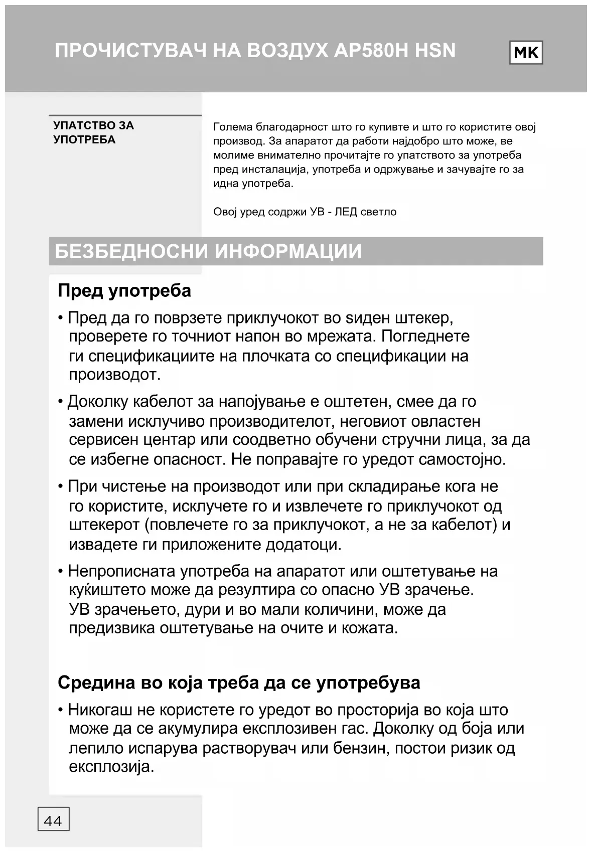 Голема благодарност што го купивте и што го користите овој производ. За апаратот да работи најдобро што може, ве молиме внимателно прочитајте го упатството за употреба пред инсталација, употреба и одржување и зачувајте го за идна употреба. Овој уред содржи УВ - ЛЕД светло УПАТСТВО ЗА УПОТРЕБА Пред употреба