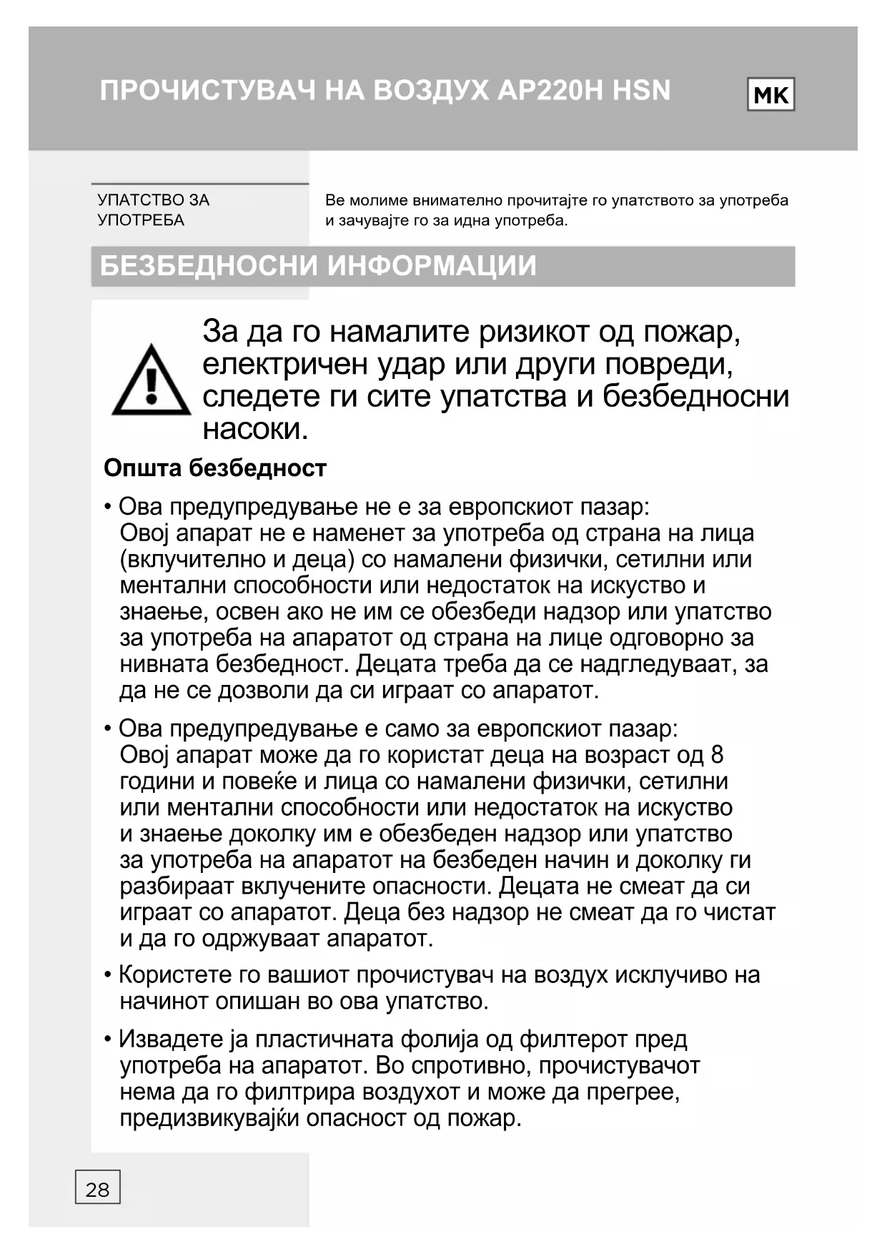- Извадете ја пластичната фолија од филтерот пред употреба на апаратот. Во спротивно, прочистувачот нема да го филтрира воздухот и може да прегрее, предизвикувајќи опасност од пожар. БЕЗБЕДНОСНИ ИНФОРМАЦИИ