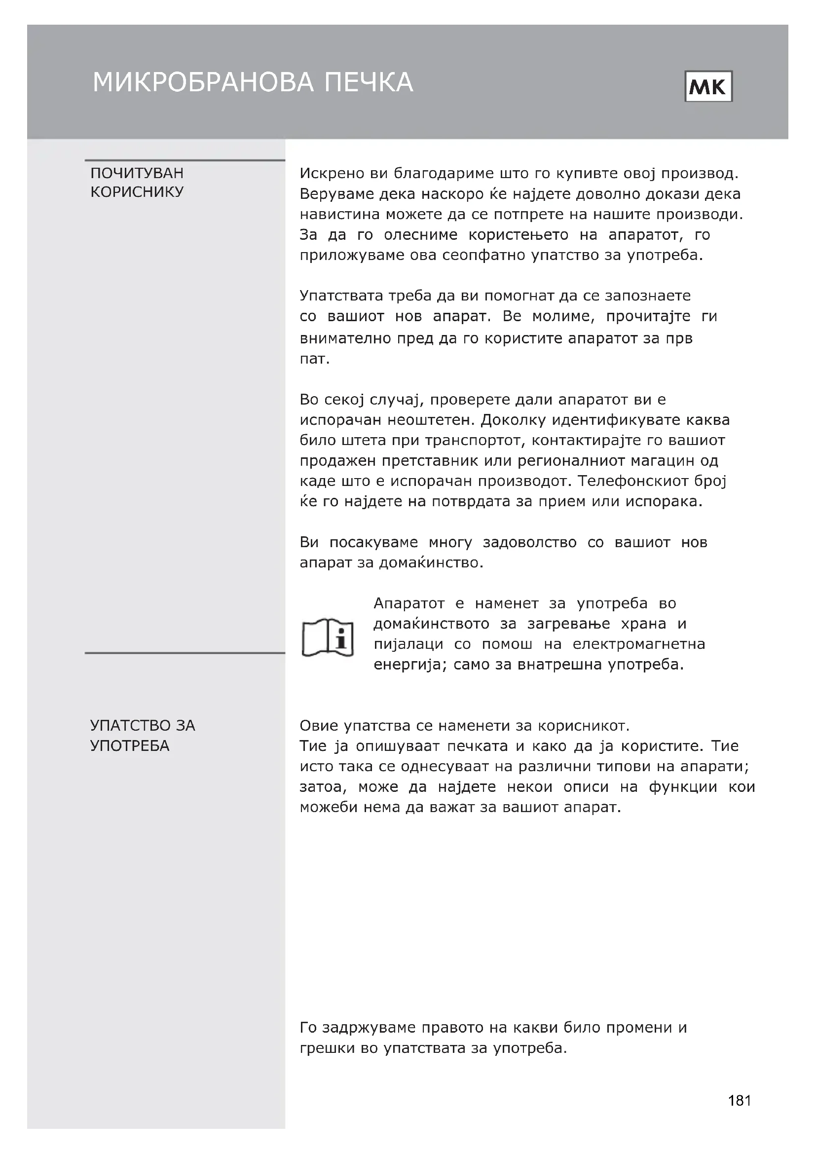 Во секој случај, проверете дали апаратот ви е испорачан неоштетен. Доколку идентификувате каква било штета при транспортот, контактирајте го вашиот продажен претставник или регионалниот магацин од каде што е испорачан производот. Телефонскиот број ќе го најдете на потврдата за прием или испорака. Ви посакуваме многу задоволство со вашиот нов апарат за домаќинство. Апаратот е наменет за употреба во домаќинството за загревање храна и пијалаци со помош на електромагнетна енергија; само за внатрешна употреба. УПАТСТВО ЗА