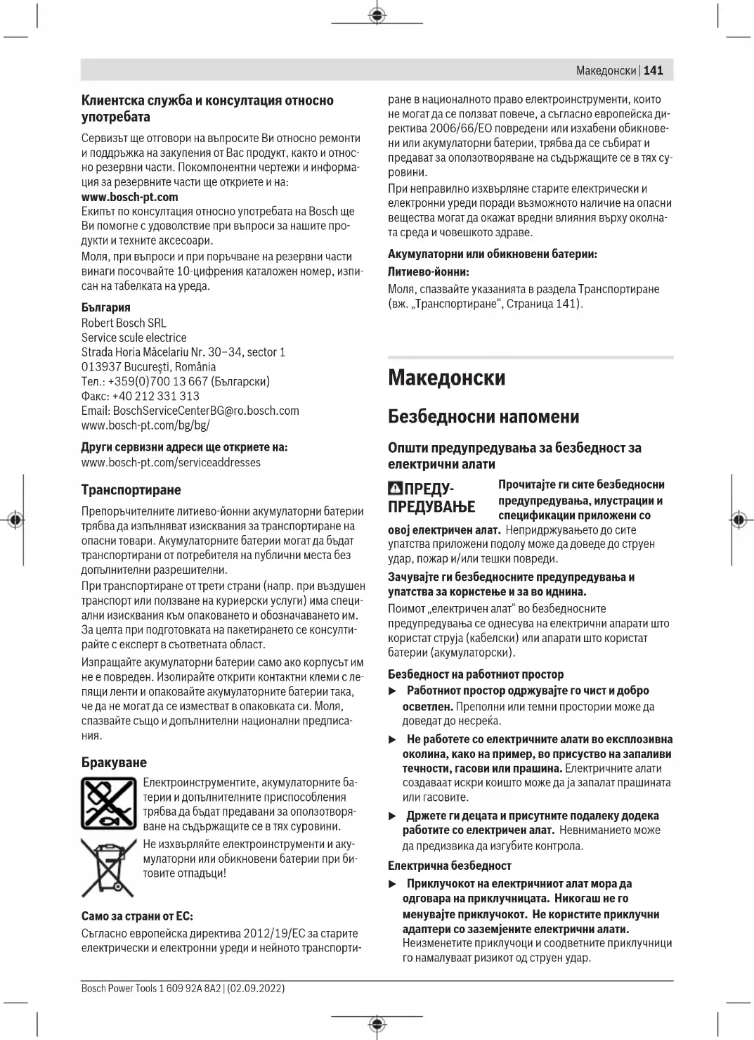 Препорачаните литиум-јонски батерии подлежат на барањата на Законот за опасни материјали. Батериите може да се транспортираат само од страна на корисникот, без потреба од дополнителни квалификации. При пренос на истите од страна на трети лица (на пр. воздушен транспорт или шпедиција) неопходно е да се внимава на специјалните напомени на амбалажата и ознаките. Во таков случај, при подготовката на пратката мора да се повика експерт за опасни супстанци. Транспортирајте ги батериите само доколку куќиштето е неоштетено. Залепете ги отворените контакти и спакувајте ја батеријата на тој начин што нема да се движи во амбалажата. Ве молиме внимавајте на евентуалните дополнителни национални прописи. Отстранување Електричните апарати, батериите, опремата и амбалажите треба да се отстранат на еколошки прифатлив начин. Не ги фрлајте електричните апарати и батериите во домашната канта за ѓубре! Само за земјите од ЕУ: Според европската директива 2012/19/EU за стари електрични и електронски уреди и нивната употреба во националното законодавство, електричните алати што се вон употреба и дефектните или искористените батерии според директивата 2006/66/EC мора одделно да се соберат и да се рециклираат за повторна употреба. Доколку се отстрануваат неправилно, електричната и електронската опрема може да имаат штетни влијанија Bosch Power Tools 1 609 92A 8A2 | (02.09.2022)148 | Srpski врз животната средина и здравјето на луѓето поради можното присуство на опасни материи.
