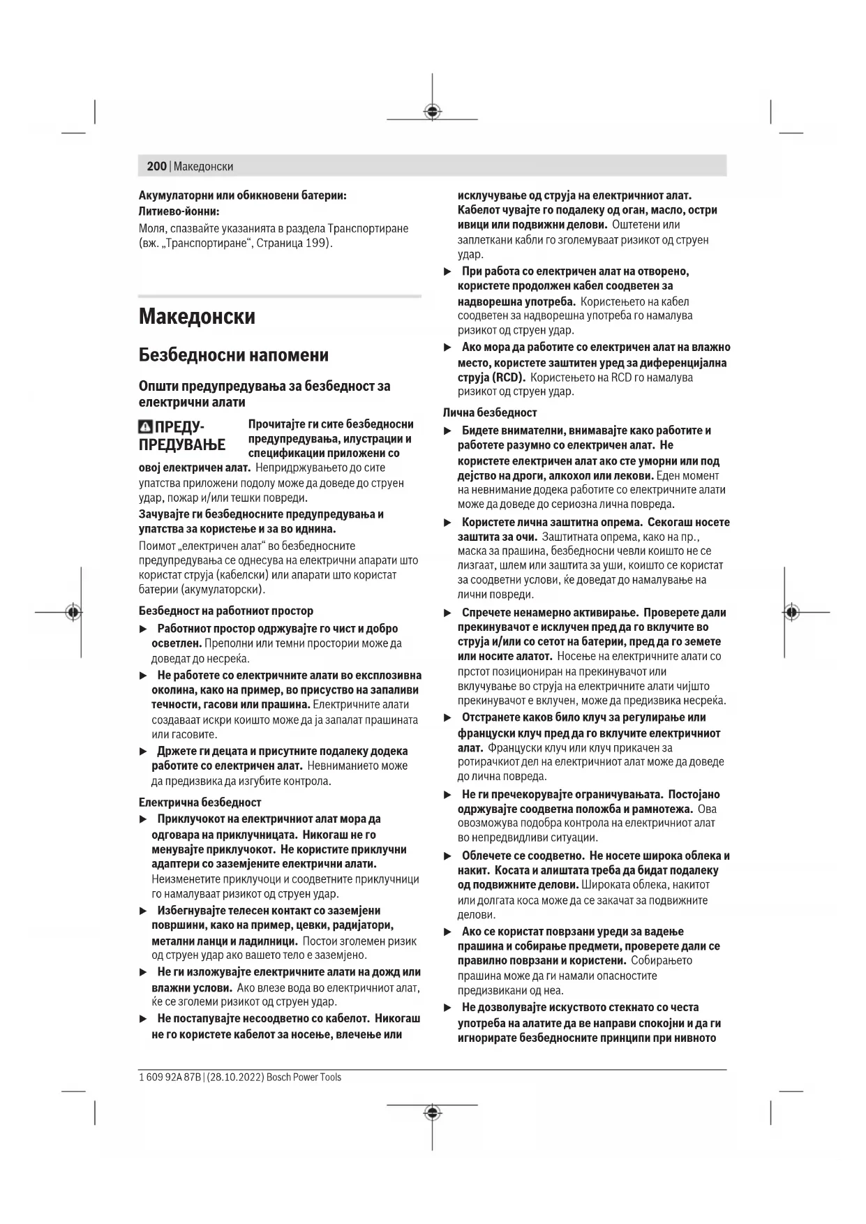 Прочитајте ги сите безбедносни предупредувања, илустрации и спецификации приложени со овој електричен алат. Непридржувањето до сите упатства приложени подолу може да доведе до струен удар, пожар и/или тешки повреди. Зачувајте ги безбедносните предупредувања и упатства за користење и за во иднина. Поимот „електричен алат“ во безбедносните предупредувања се однесува на електрични апарати што користат струја (кабелски) или апарати што користат батерии (акумулаторски). Безбедност на работниот простор u Работниот простор одржувајте го чист и добро осветлен. Преполни или темни простории може да доведат до несреќа. u Не работете со електричните алати во експлозивна околина, како на пример, во присуство на запаливи течности, гасови или прашина. Електричните алати создаваат искри коишто може да ја запалат прашината или гасовите. u Држете ги децата и присутните подалеку додека работите со електричен алат. Невниманието може да предизвика да изгубите контрола. Електрична безбедност u Приклучокот на електричниот алат мора да одговара на приклучницата. Никогаш не го менувајте приклучокот. Не користите приклучни адаптери со заземјените електрични алати. Неизменетите приклучоци и соодветните приклучници го намалуваат ризикот од струен удар. u Избегнувајте телесен контакт со заземјени површини, како на пример, цевки, радијатори, метални ланци и ладилници. Постои зголемен ризик од струен удар ако вашето тело е заземјено. u Не ги изложувајте електричните алати на дожд или влажни услови. Ако влезе вода во електричниот алат, ќе се зголеми ризикот од струен удар. u Не постапувајте несоодветно со кабелот. Никогаш не го користете кабелот за носење, влечење или исклучување од струја на електричниот алат. Кабелот чувајте го подалеку од оган, масло, остри ивици или подвижни делови. Оштетени или заплеткани кабли го зголемуваат ризикот од струен