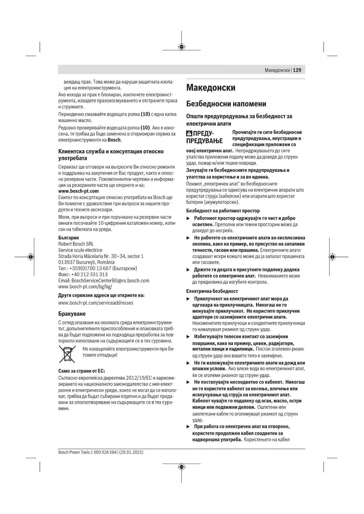 Големи нечистотии можат да доведат до пречки во функционирањето. Затоа не сечете од долу или над глава материјали што прават многу прашина. u При екстремни услови на примена, доколку е возможно секогаш користете уред за всисување. Издувувајте ги почесто отворите за проветрување и приклучете заштитен прекинувач за диференцијална струја (PRCD). При обработка на метали, во внатрешноста на електричниот алат може да се собере спроводлива прав. Може да се оштети заштитната изолација на електричниот алат. Доколку излезот за прашина се затне, исклучете го електричниот алат, извадете го всисувачот за прашина и отстранете ги прашината и струготините. Подмачкајте го водечкиот валјак (10) одвреме-навреме со неколку капки масло. Редовно проверувајте го водечкиот валјак(10). Доколку е истрошен, мора да се замени во овластената специјализирана продавница Bosch. 1 609 92A 5B4 | (29.01.2021) Bosch Power ToolsSrpski | 135 Сервисна служба и совети при користење Сервисната служба ќе одговори на Вашите прашања во врска со поправката и одржувањето на Вашиот производ како и резервните делови. Ознаки за експлозија и информации за резервните делови исто така ќе најдете на: www.bosch-pt.com Тимот за советување при користење на Bosch ќе ви помогне доколку имате прашања за нашите производи и