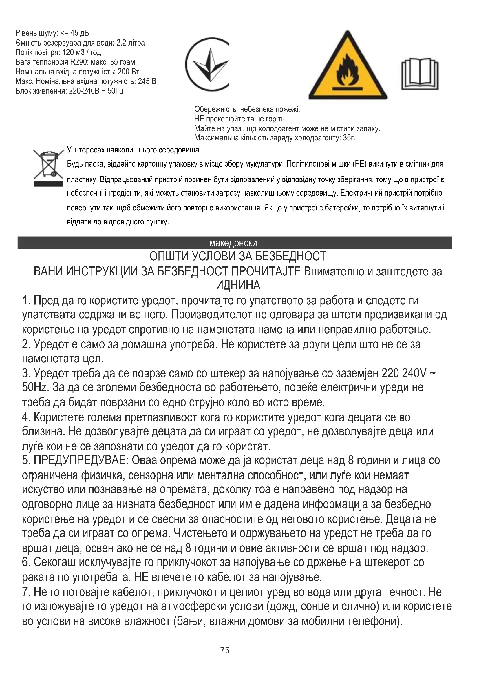 ТЕХНИЧКИ ПОДАТОЦИ: Капацитет на дехидрификација на 30 ° C / 80% RH): 10 литри / 24 часа Капацитет на дехидрификација на 27 ° C / 60% RH): 5 литри / 24 часа Ниво на бучава: <= 45dB Капацитет на резервоарот за вода: 2,2 литри Проток на воздух: 120 m3 / h Тежина на течноста за ладење R290: макс. 35 грама Оценета влезна моќност: 200W Макс. Оценета влезна моќност: 245W Напојување: 220-240V ~ 50Hz Се грижиме за природната средина. Картонските паковки молиме да се наменат за рециклирање. Полиетиленовите кеси (PE) да се фрлат во контењер за пластика. Искористениот уред треба да се предаде во соодветниот складирачки пункт, бидејќи небезбедните состојки кои се наоѓаат во уредот можат да бидат загрозување за средината. Електричниот уред треба да се предаде на начин кој ќе оневозможи негова повторна употреба и искористување. Доколку во уредот има батерии, треба да се извадат и посебно да се предадат во складирачкиот пункт. Внимание, ризик од пожар. НЕ пирснувајте или изгорувајте. Бидете свесни дека ладилното средство може да не содржи мирис. Максимална количина на полнење за ладење: 35g. SLOVENSKY