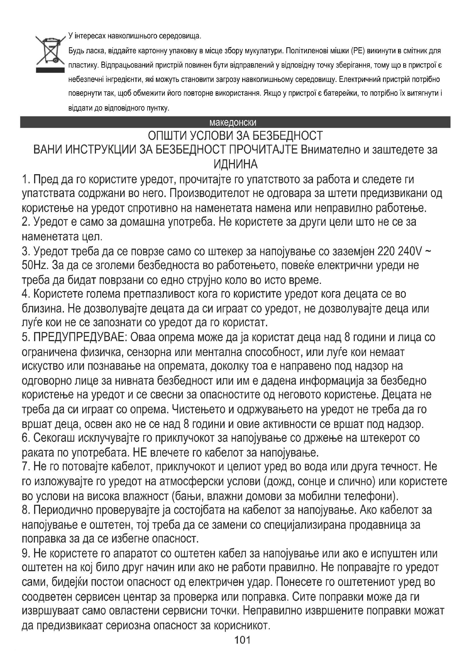 упатствата содржани во него. Производителот не одговара за штети предизвикани од користење на уредот спротивно на наменетата намена или неправилно работење.
