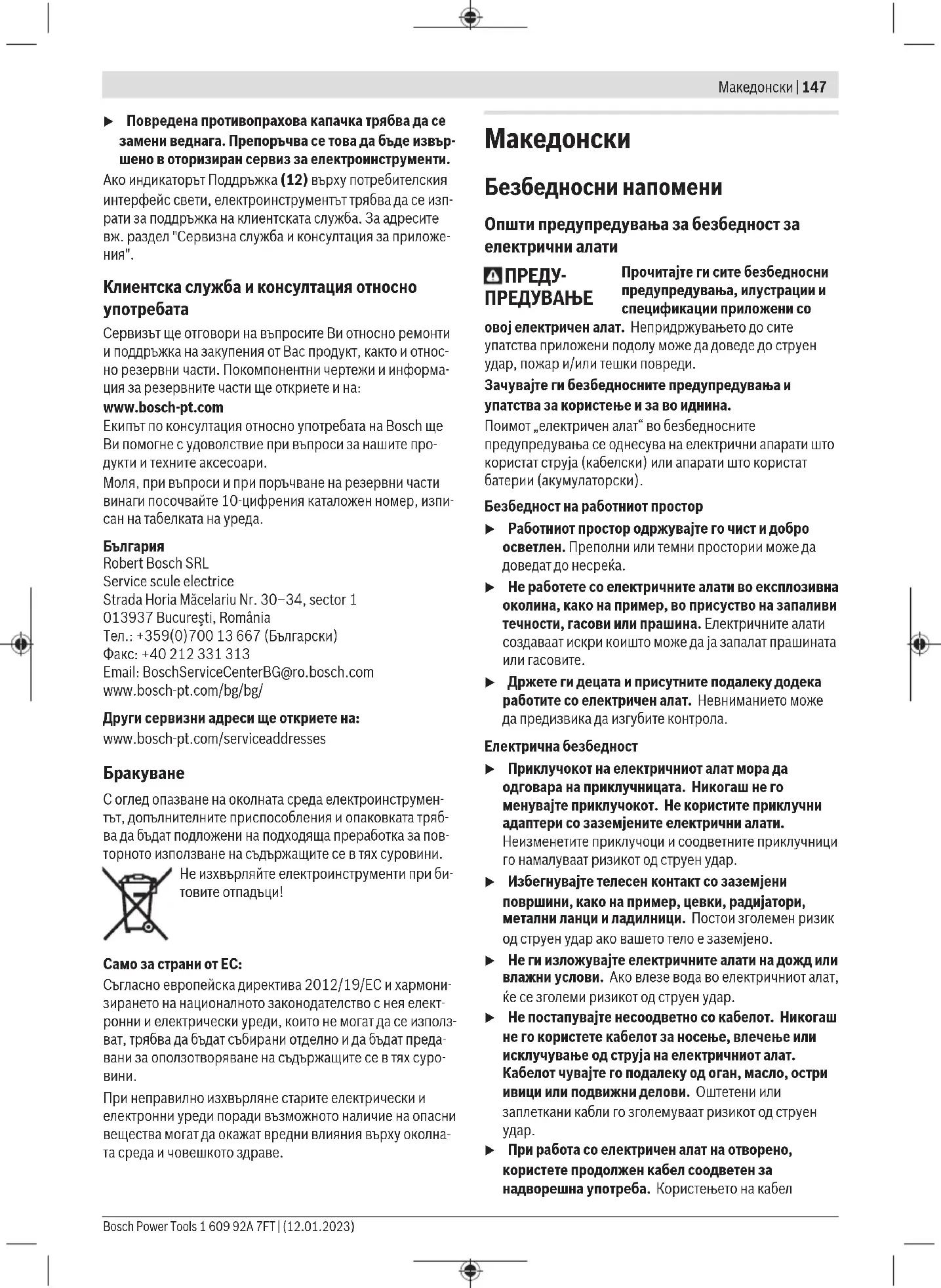 Сервисирање u Електричниот алат сервисирајте го кај квалификувано лице кое користи само идентични резервни делови. Со ова се овозможува безбедно одржување на електричниот алат. Безбедносни напомени за чекани Безбедносни упатства за сите типови работа u Носете штитници за уши. Изложеноста на бучава може да предизвика губење на слухот. u Користете дополнителни рачки, доколку се испорачани со алатот. Губење на контрола може да предизвика телесни повреди. u Држете го електричниот алат за изолираната површина додека сечете, за да не дојде во контакт со скриена жица или со неговиот кабел. Ако 1 609 92A 7FT | (12.01.2023) Bosch Power ToolsМакедонски | 149 опремата за сечење дојде во допир со „жица под напон“, може да ги изложи металните делови на електричниот алат „под напон“ и операторот може да добие струен удар. Дополнителни безбедносни напомени u Користете соодветни уреди за пребарување, за да ги пронајдете скриените електрични кабли или консултирајте се со локалното претпријатие за снабдување со електрична енергија. Контактот со електрични кабли може да доведе до пожар и струен удар. Оштетувањето на гасоводот може да доведе до експлозија. Навлегувањето во водоводни цевки предизвикува оштетување и може да предизвика електричен удар. u Почекајте додека електричниот алат сосема не прекине со работа, пред да го тргнете настрана. Алатот што се вметнува може да се блокира и да доведе до губење контрола над уредот. u Зацврстете го парчето што се обработува. Доколку го зацврстите со уред за затегнување или менгеме, тогаш парчето што се обработува се држи поцврсто отколку со Вашата рака. u Кратко по употребата не ги допирајте алатите за вметнување или соседните делови на куќиштето. За време на работата тие може да бидат многу жешки и да предизвикаат изгореници. u Бидете внимателни за време на кршењето со длето. Деловите што паѓаат од материјалот за кршење може да ги повредат присутните или себе си. u При работата, држете го електричниот алат цврсто со двете дланки и застанете во сигурна положба. Со електричниот алат посигурно ќе управувате ако го држите со двете дланки. Ознаката со зборови Bluetooth® како и сликите (логоата) се регистрирани марки и сопственост на Bluetooth SIG, Inc. Секое користење на оваа ознака со зборови/слики се врши со лиценца преку Robert Bosch Power Tools GmbH.