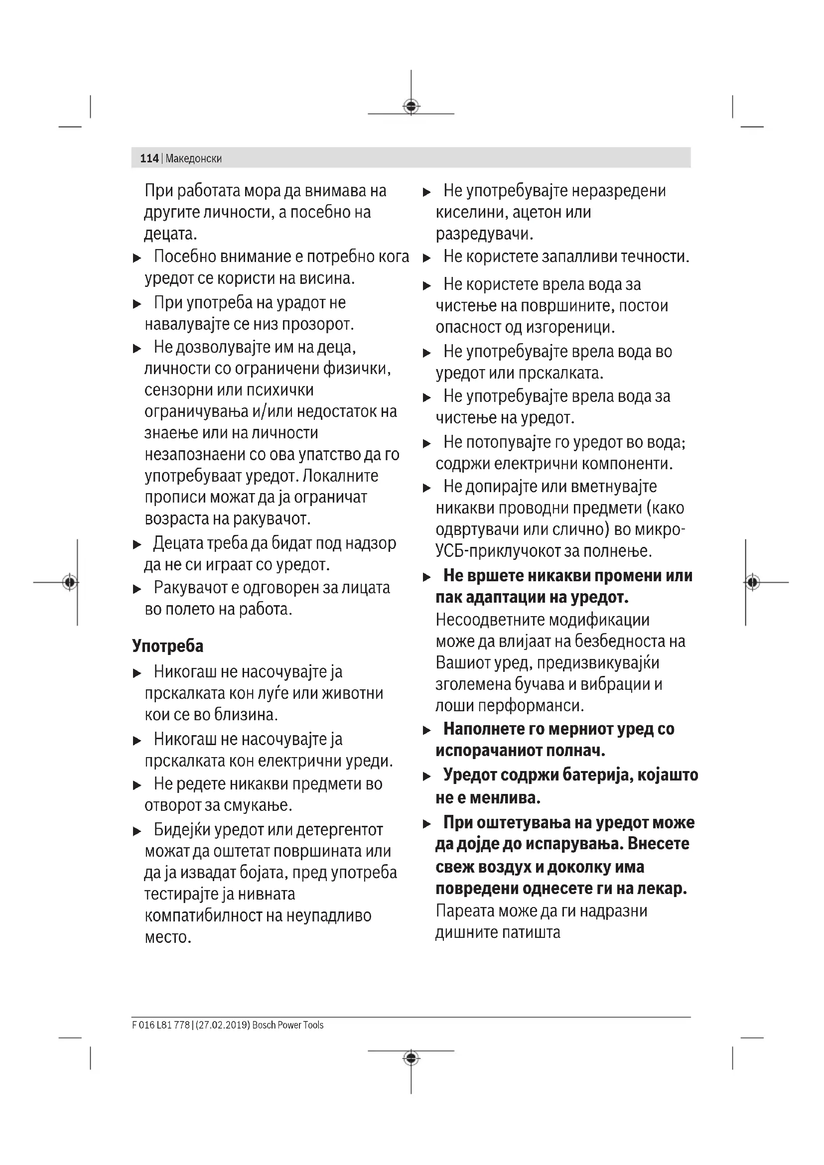 u Ракувачот мора да ракува со уредот во склад со прописите. При ракувањето со уредот мора да ги земе пред вид конкретните услови. Bosch Power Tools F 016 L81 778 | (27.02.2019)114 | Македонски При работата мора да внимава на другите личности, а посебно на