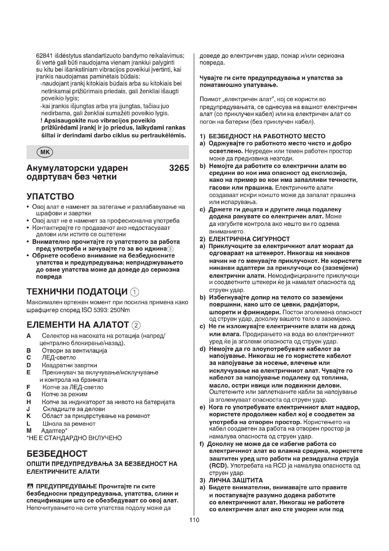 ОПШТИ ПРЕДУПРЕДУВАЊА ЗА БЕЗБЕДНОСТ НА ЕЛЕКТРИЧНИТЕ АЛАТИ - ПРЕДУПРЕДУВАЊЕ Прочитајте ги сите безбедносни предупредувања, упатства, слики и спецификации што се обезбедуваат со овој алат. Непочитувањето на сите упатства подолу може да111