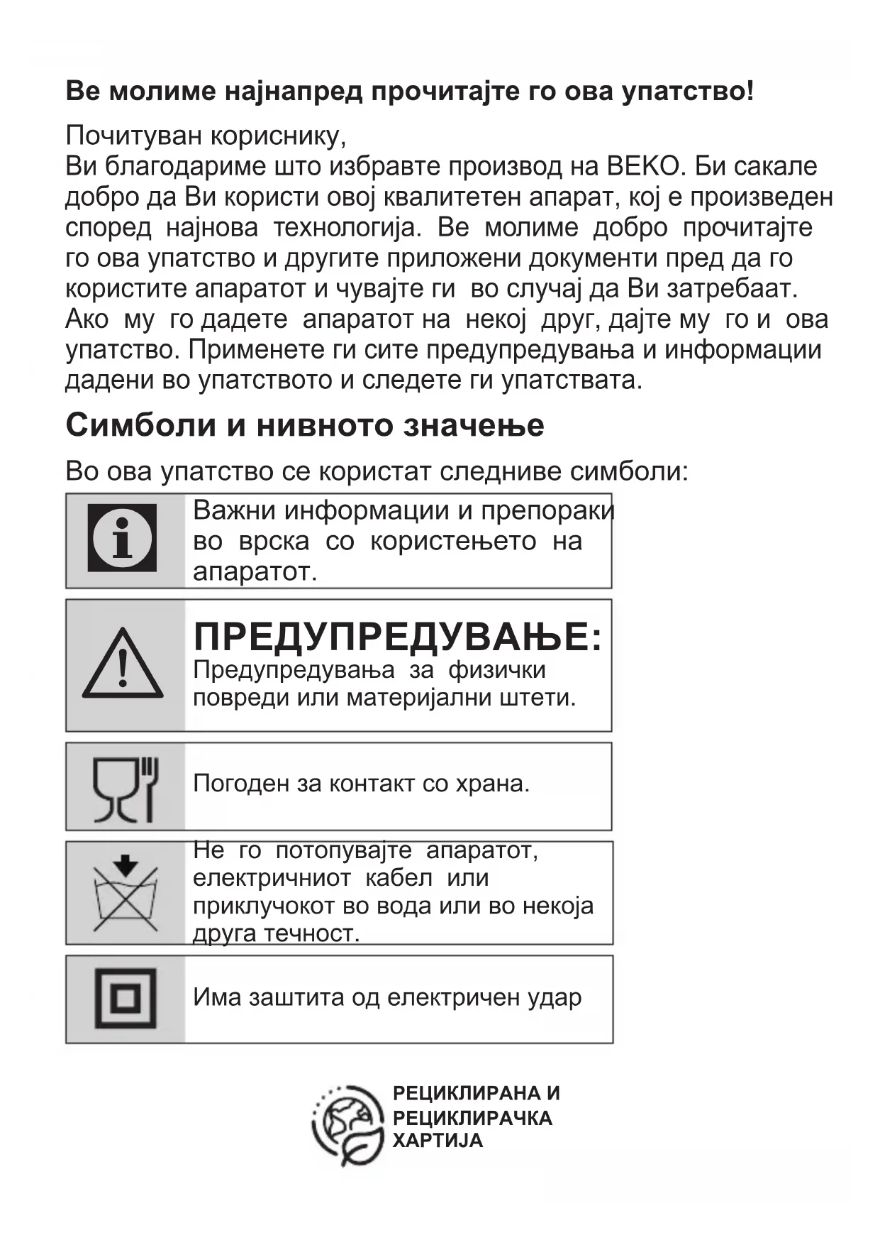 - Nëse pajisja bie, pajisja mund të mos funksionojë ose mund të ndodhë dëmtim i përhershëm.Ве молиме најнапред прочитајте го ова упатство! Почитуван кориснику, Ви благодариме што избравте производ на BEKO. Би сакале добро да Ви користи овој квалитетен апарат, кој е произведен според најнова технологија. Ве молиме добро прочитајте го ова упатство и другите приложени документи пред да го користите апаратот и чувајте ги во случај да Ви затребаат. Ако му го дадете апаратот на некој друг, дајте му го и ова упатство. Применете ги сите предупредувања и информации дадени во упатството и следете ги упатствата. Симболи и нивното значење Во ова упатство се користат следниве симболи: