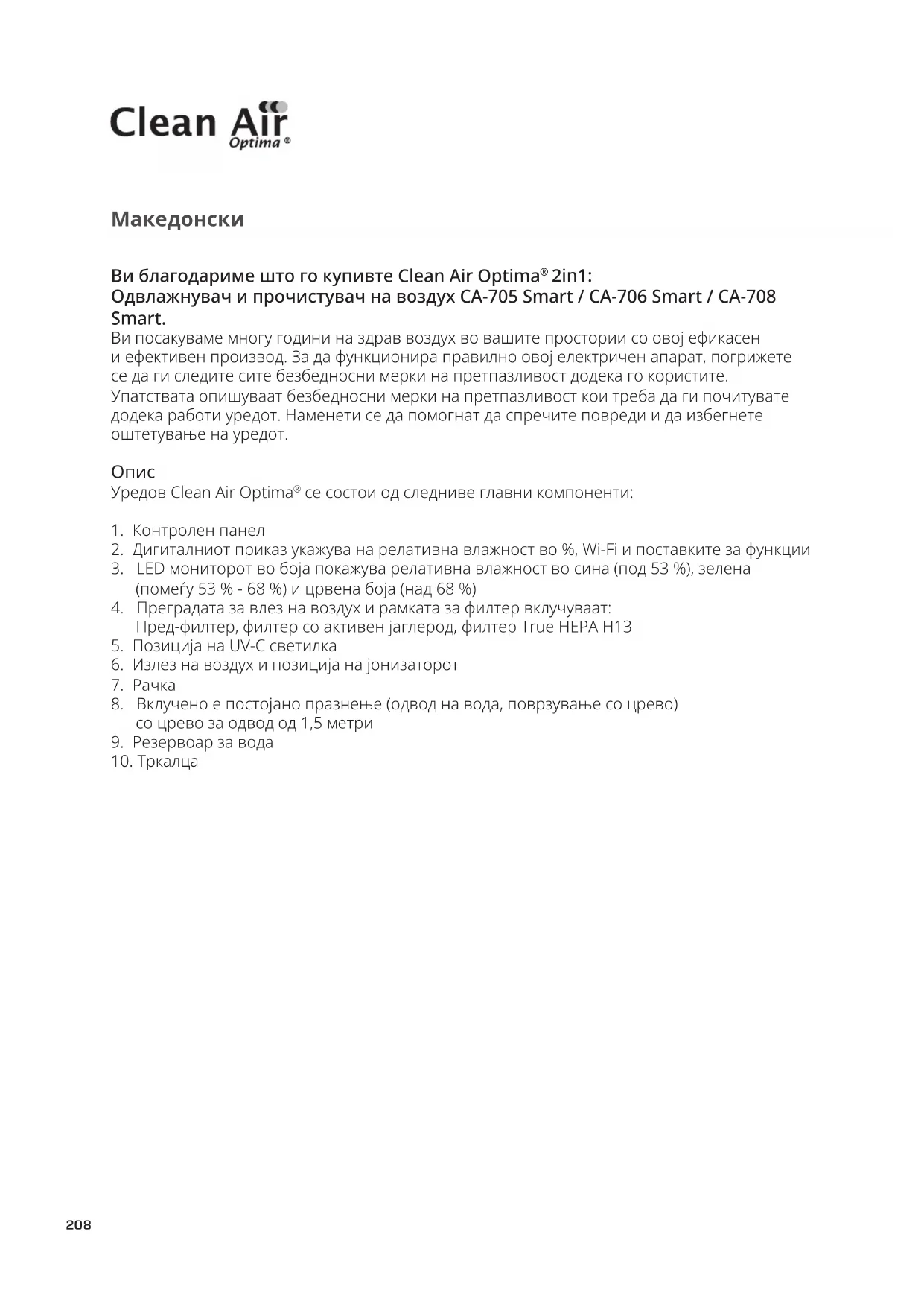 2in1: Одвлажнувач ипрочистувач на воздух CA-705 Smart / CA-706 Smart / CA-708 Smart. Ви посакуваме многу години на здрав воздух во вашите простории со овој ефикасен иефективен производ. За да функционира правилно овој електричен апарат, погрижете седа ги следите сите безбедносни мерки на претпазливост додека го користите. Упатствата опишуваат безбедносни мерки на претпазливост кои треба да ги почитувате додека работи уредот. Наменети се да помогнат да спречите повреди и да избегнете оштетување на уредот.