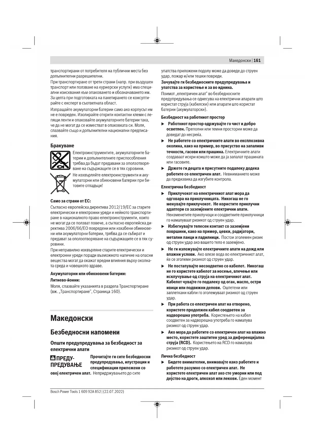 u При работа со електричен алат на отворено, користете продолжен кабел соодветен за надворешна употреба. Користењето на кабел соодветен за надворешна употреба го намалува ризикот од струен удар. u Ако мора да работите со електричен алат на влажно место, користете заштитен уред за диференцијална струја (RCD). Користењето на RCD го намалува ризикот од струен удар. Лична безбедност u Бидете внимателни, внимавајте како работите и работете разумно со електричен алат. Не користете електричен алат ако сте уморни или под дејство на дроги, алкохол или лекови. Еден момент Bosch Power Tools 1 609 92A 852 | (22.07.2022)162 | Македонски на невнимание додека работите со електричните алати може да доведе до сериозна лична повреда. u Користете лична заштитна опрема. Секогаш носете заштита за очи. Заштитната опрема, како на пр., маска за прашина, безбедносни чевли коишто не се лизгаат, шлем или заштита за уши, коишто се користат за соодветни услови, ќе доведат до намалување на лични повреди. u Спречете ненамерно активирање. Проверете дали прекинувачот е исклучен пред да го вклучите во струја и/или со сетот на батерии, пред да го земете или носите алатот. Носење на електричните алати со прстот позициониран на прекинувачот или вклучување во струја на електричните алати чијшто прекинувачот е вклучен, може да предизвика несреќа. u Отстранете каков било клуч за регулирање или француски клуч пред да го вклучите електричниот алат. Француски клуч или клуч прикачен за ротирачкиот дел на електричниот алат може да доведе до лична повреда. u Не ги пречекорувајте ограничувањата. Постојано одржувајте соодветна положба и рамнотежа. Ова овозможува подобра контрола на електричниот алат во непредвидливи ситуации. u Облечете се соодветно. Не носете широка облека и накит. Косата и алиштата треба да бидат подалеку од подвижните делови. Широката облека, накитот или долгата коса може да се закачат за подвижните