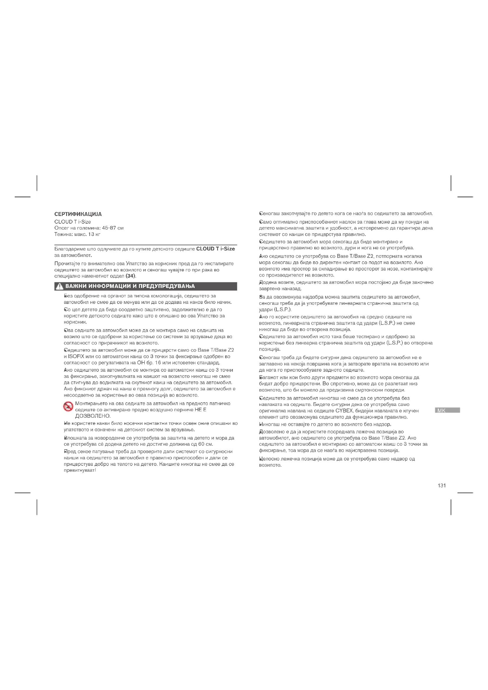 Благодариме што одлучивте да го купите детското седиште CLOUD T i-Size за автомобилот. Прочитајте го внимателно ова Упатство за корисник пред да го инсталирате седиштето за автомобил во возилото и секогаш чувајте го при рака во специјално наменетиот оддел (34). ВАЖНИ ИНФОРМАЦИИ И ПРЕДУПРЕДУВАЊА