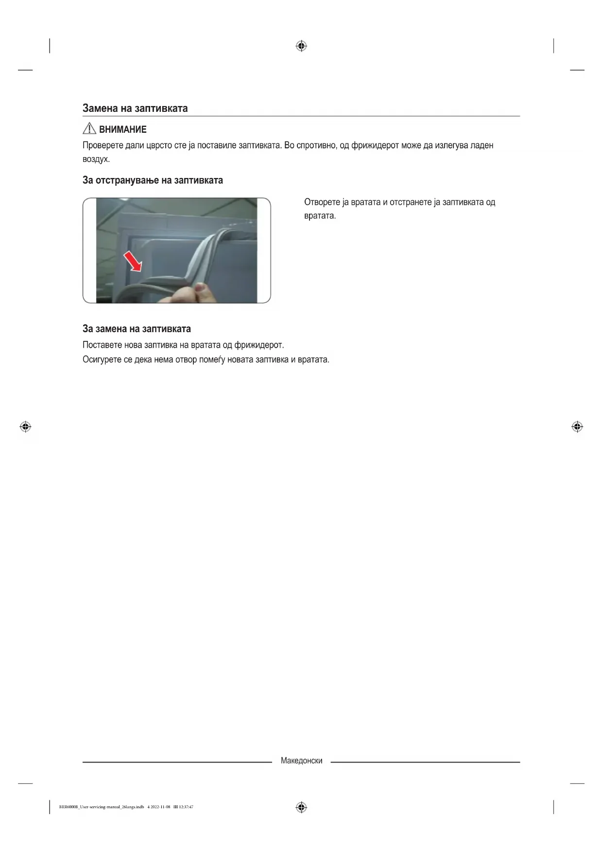 За замена на заптивката Поставете нова заптивка на вратата од фрижидерот. Осигурете се дека нема отвор помеѓу новата заптивка и вратата. BRR6000B_User-servicing-manual_26langs.indb 4 2022-11-08 12:37:47Македонски Замена на фиоката