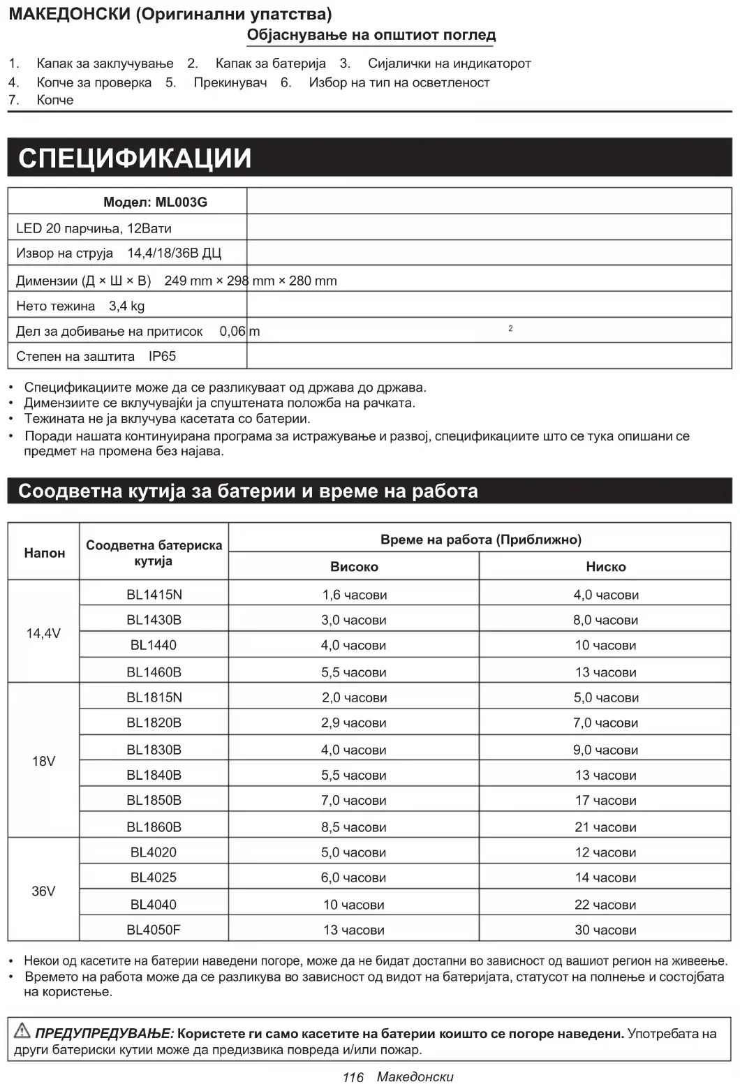 - Времетонаработаможедасеразликувавозависностодвидотнабатеријата,статусотнаполнењеисостојбата накористење. ПРЕДУПРЕДУВАЊЕ: Користете ги само касетите на батерии коишто се погоре наведени.Употребатана другибатерискикутииможедапредизвикаповредаи/илипожар. Македонски117
