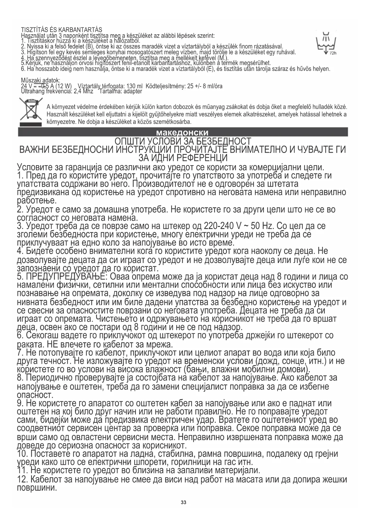 6. Ако не се користи долго време, истурете ја преостанатата вода од резервоарот за вода (E) и чувајте ја на суво и ладно место по чистењето. Технички податоци: 24V 0,5A (12W) Волумен на резервоар за вода: 130 ml Капацитет на магла: 25 +/- 8 ml/час Ултразвучна фреквенција: 2,4 Mhz Вклучено: адаптер За да се заштитат вашата околина: ве молиме одделни кутии и пластични кеси и да располага со нив во соодветните канти за отпадоци. Користи апаратот треба да биде предаден на посветен собирање поени поради hazarsous компоненти, кои можат да влијаат на животната средина. Не фрлајте овој апарат во заедничката корпа за отпадоци.