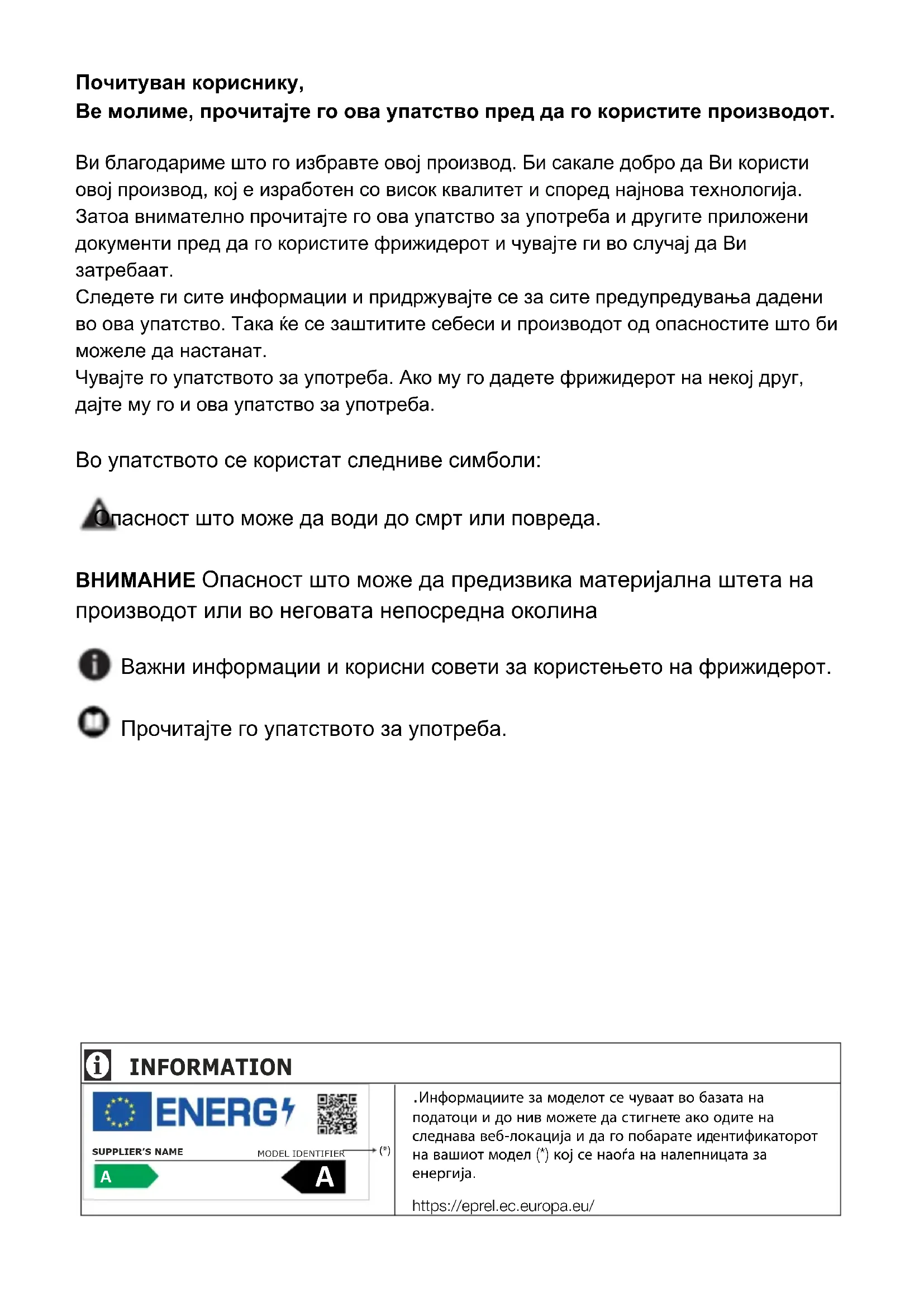 MK/SB 58 5173 0000/AH-4/4 MK-SBПочитуван кориснику, Ве молиме, прочитајте го ова упатство пред да го користите производот. Ви благодариме што го избравте овој производ. Би сакале добро да Ви користи овој производ, кој е изработен со висок квалитет и според најнова технологија. Затоа внимателно прочитајте го ова упатство за употреба и другите приложени документи пред да го користите фрижидерот и чувајте ги во случај да Ви затребаат. Следете ги сите информации и придржувајте се за сите предупредувања дадени во ова упатство. Така ќе се заштитите себеси и производот од опасностите што би можеле да настанат.Чувајте го упатството за употреба. Ако му го дадете фрижидерот на некој друг, дајте му го и ова упатство за употреба. Во упатството се користат следниве симболи: Опасност што може да води до смрт или повреда. ВНИМАНИЕ Опасност што може да предизвика материјална штета на производот или во неговата непосредна околина Важни информации и корисни совети за користењето на фрижидерот. Прочитајте го упатството за употреба. .Информациите за моделот се чуваат во базата на податоци и до нив можете да стигнете ако одите на следнава веб-локација и да го побарате идентификаторот на вашиот модел (*) кој се наоѓа на налепницата за енергија.https://eprel.ec.europa.eu/