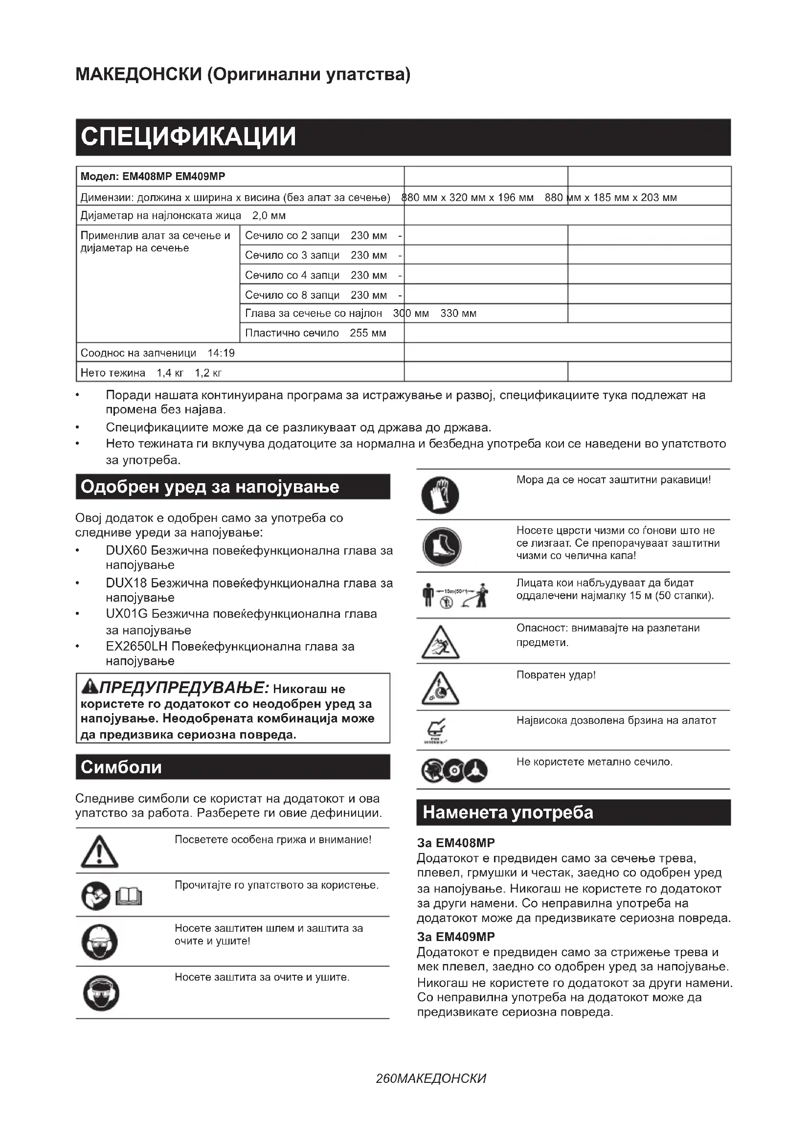 Повратенудар! Највисокадозволенабрзинанаалатот Некористетеметалносечило. Наменета употреба За EM408MP Додатокотепредвиденсамозасечењетрева, плевел,грмушкиичестак,заедносоодобренуред занапојување.Никогашнекористетегододатокот задругинамени.Сонеправилнаупотребана додатокотможедапредизвикатесериознаповреда. За EM409MP Додатокотепредвиденсамозастрижењетреваи мекплевел,заедносоодобренуредзанапојување. Никогашнекористетегододатокотзадругинамени. Сонеправилнаупотребанадодатокотможеда предизвикатесериознаповреда.261 МАКЕДОНСКИ ПРЕДУПРЕДУВАЊЕ: Пред употреба, прочитајте го упатството за употреба на додатокот како и ова упатство за работа.Ако несепочитуваатпредупредувањатаиупатствата, можедадојдедосериозниповреди. Декларација за сообразност на ЕУ Само за земјите во Европа Ниекакопроизводители:Makita Europe N.V., деловнаадреса:Jan-Baptist Vinkstraat 2 3070 Kortenberg BELGIUM.гоовластувамеKazuhisa Makinoзасоставувањенатехничкиотдокументисо нашацелосналичнаодговорностизјавувамедека производите; Ознака:Додаток за тримерот за трева.Ознакана типот(овите):EM408MP/EM409MP. гиисполнуваатситерелевантниодредбиод 2006/42/ECиистотакагиисполнуваатрелевантните одредбиодследнивеДирективинаЕЗ/ЕУ:2000/14/ ECисепроизведенивосогласностсоследниве хармонизиранистандарди:EN ISO 11806-1:2022, EN 62841-1:2015+A11:2022. Местоидатумнаизјавата:Контенберг, Белгија. 1.