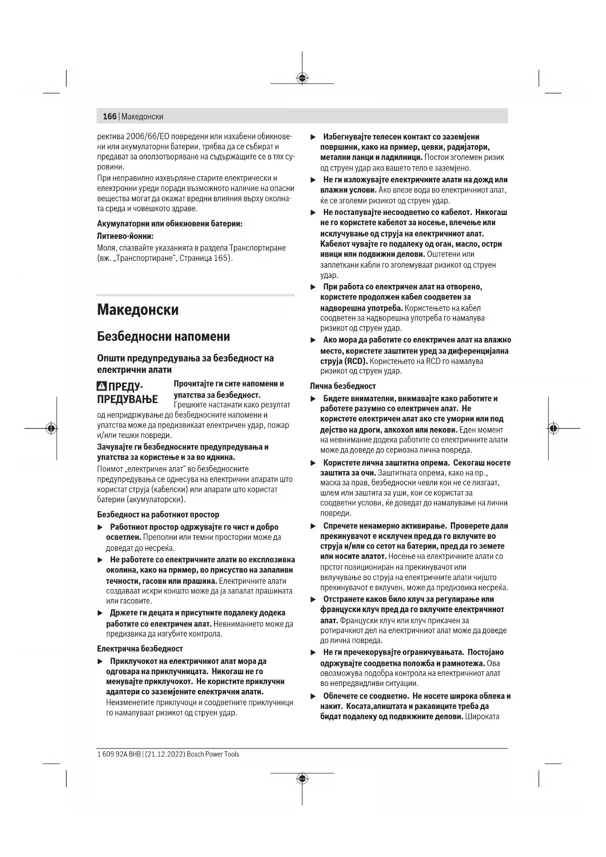 Прочитајте ги сите напомени и упатства за безбедност. Грешките настанати како резултат од непридржување до безбедносните напомени и упатства може да предизвикаат електричен удар, пожар и/или тешки повреди. Зачувајте ги безбедносните предупредувања и упатства за користење и за во иднина. Поимот „електричен алат“ во безбедносните предупредувања се однесува на електрични апарати што користат струја (кабелски) или апарати што користат батерии (акумулаторски). Безбедност на работниот простор u Работниот простор одржувајте го чист и добро осветлен. Преполни или темни простории може да доведат до несреќа. u Не работете со електричните алати во експлозивна околина, како на пример, во присуство на запаливи течности, гасови или прашина. Електричните алати создаваат искри коишто може да ја запалат прашината или гасовите. u Држете ги децата и присутните подалеку додека работите со електричен алат. Невниманието може да предизвика да изгубите контрола. Електрична безбедност u Приклучокот на електричниот алат мора да одговара на приклучницата. Никогаш не го менувајте приклучокот. Не користите приклучни адаптери со заземјените електрични алати. Неизменетите приклучоци и соодветните приклучници го намалуваат ризикот од струен удар. u Избегнувајте телесен контакт со заземјени површини, како на пример, цевки, радијатори, метални ланци и ладилници. Постои зголемен ризик од струен удар ако вашето тело е заземјено. u Не ги изложувајте електричните алати на дожд или влажни услови. Ако влезе вода во електричниот алат, ќе се зголеми ризикот од струен удар. u Не постапувајте несоодветно со кабелот. Никогаш не го користете кабелот за носење, влечење или исклучување од струја на електричниот алат. Кабелот чувајте го подалеку од оган, масло, остри ивици или подвижни делови. Оштетени или заплеткани кабли го зголемуваат ризикот од струен
