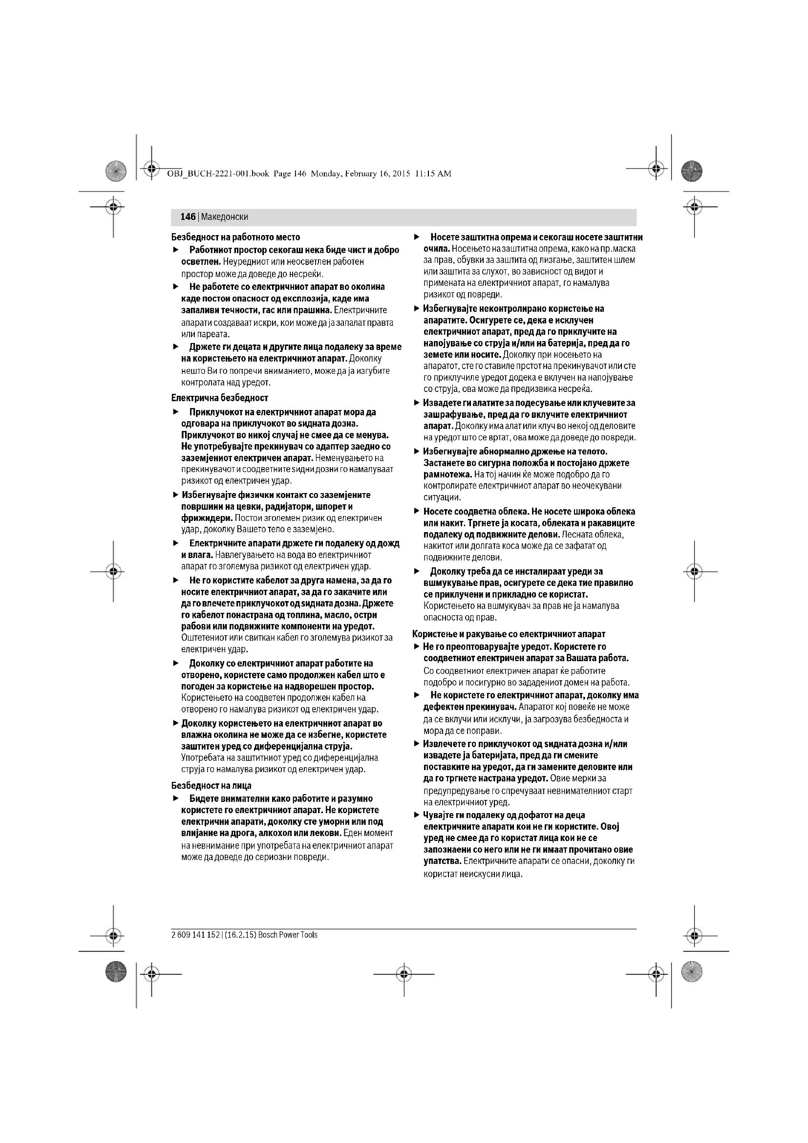 Безбедносни напомени Општи напомени за безбедност за електричните апарати Прочитајте ги сите напомени и упатства за безбедност. Грешките настанати како резултат од непридржување до безбедносните напомени и упатства може да предизвикаат електричен удар, пожар и/или тешки повреди. Зачувајте ги безбедносните напомени и упатства за користење и за во иднина. Поимот „електричен алат“ во напомените за безбедност се однесува на електрични апарати што користат струја (со струен кабел) и електрични апарати што користат батерии (без струен кабел). ПРЕДУПРЕДУВАЊЕ OBJ_BUCH-2221-001.book Page 145 Monday, February 16, 2015 11:15 AM146 | Македонски 2 609 141 152 | (16.2.15) Bosch Power Tools Безбедност на работното место Работниот простор секогаш нека биде чист и добро осветлен. Неуредниот или неосветлен работен простор може да доведе до несреќи. Не работете со електричниот апарат во околина каде постои опасност од експлозија, каде има запаливи течности, гас или прашина. Електричните апарати создаваат искри, кои може да ја запалат правта или пареата. Држете ги децата и другите лица подалеку за време на користењето на електричниот апарат. Доколку нешто Ви го попречи вниманието, може да ја изгубите контролата над уредот. Електрична безбедност Приклучокот на електричниот апарат мора да одговара на приклучокот во ѕидната дозна. Приклучокот во никој случај не смее да се менува. Не употребувајте прекинувач со адаптер заедно со заземјениот електричен апарат. Неменувањето на прекинувачот и соодветните ѕидни дозни го намалуваат ризикот од електричен удар. Избегнувајте физички контакт со заземјените површини на цевки, радијатори, шпорет и фрижидери. Постои зголемен ризик од електричен удар, доколку Вашето тело е заземјено. Електричните апарати држете ги подалеку од дожд и влага. Навлегувањето на вода во електричниот апарат го зголемува ризикот од електричен удар. Не го користите кабелот за друга намена, за да го носите електричниот апарат, за да го закачите или да го влечете приклучокот од ѕидната дозна. Држете го кабелот понастрана од топлина, масло, остри рабови или подвижните компоненти на уредот. Оштетениот или свиткан кабел го зголемува ризикот за електричен удар. Доколку со електричниот апарат работите на отворено, користете само продолжен кабел што е погоден за користење на надворешен простор. Користењето на соодветен продолжен кабел на отворено го намалува ризикот од електричен удар. Доколку користењето на електричниот апарат во влажна околина не може да се избегне, користете заштитен уред со диференцијална струја. Употребата на заштитниот уред со диференцијална струја го намалува ризикот од електричен удар. Безбедност на лица Бидете внимателни како работите и разумно користете го електричниот апарат. Не користете електрични апарати, доколку сте уморни или под влијание на дрога, алкохол или лекови. Еден момент на невнимание при употребата на електричниот апарат може да доведе до сериозни повреди. Носете заштитна опрема и секогаш носете заштитни очила. Носењето на заштитна опрема, како на пр.маска за прав, обувки за заштита од лизгање, заштитен шлем или заштита за слухот, во зависност од видот и примената на електричниот а парат, го намалува ризикот од повреди. Избегнувајте неконтролирано користење на апаратите. Осигурете се, дека е исклучен електричниот апарат, пред да го при