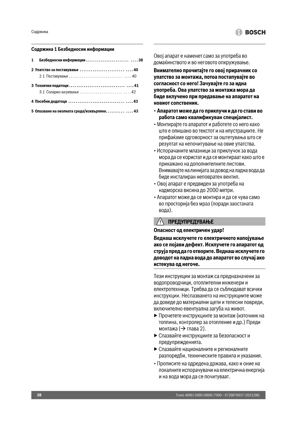 ПРЕДУПРЕДУВАЊЕ Опасност од електричен удар! Веднаш исклучете го електричното напојување ако се појави дефект. Исклучете го апаратот од струја пред да го отворите. Веднаш исклучете го доводот на ладна вода до апаратот во случај ако истекува од негоче. Тези инструкции за монтаж са предназначени за водопроводчици, отоплителни инженери и електротехници. Трябва да се съблюдават всички инструкции. Неспазването на инструкциите може да доведе до материални щети и телесни повреди, включително евентуална загуба на живот. ▶ Прочетете инструкциите за монтаж (източник на топлина, контролер за отопление и др.) Преди монтажа ( глава 2). ▶ Спазвайте инструкциите за безопасност и предупрежденията. ▶ Спазвайте националните и регионалните разпоредби, техническите правила и указания.