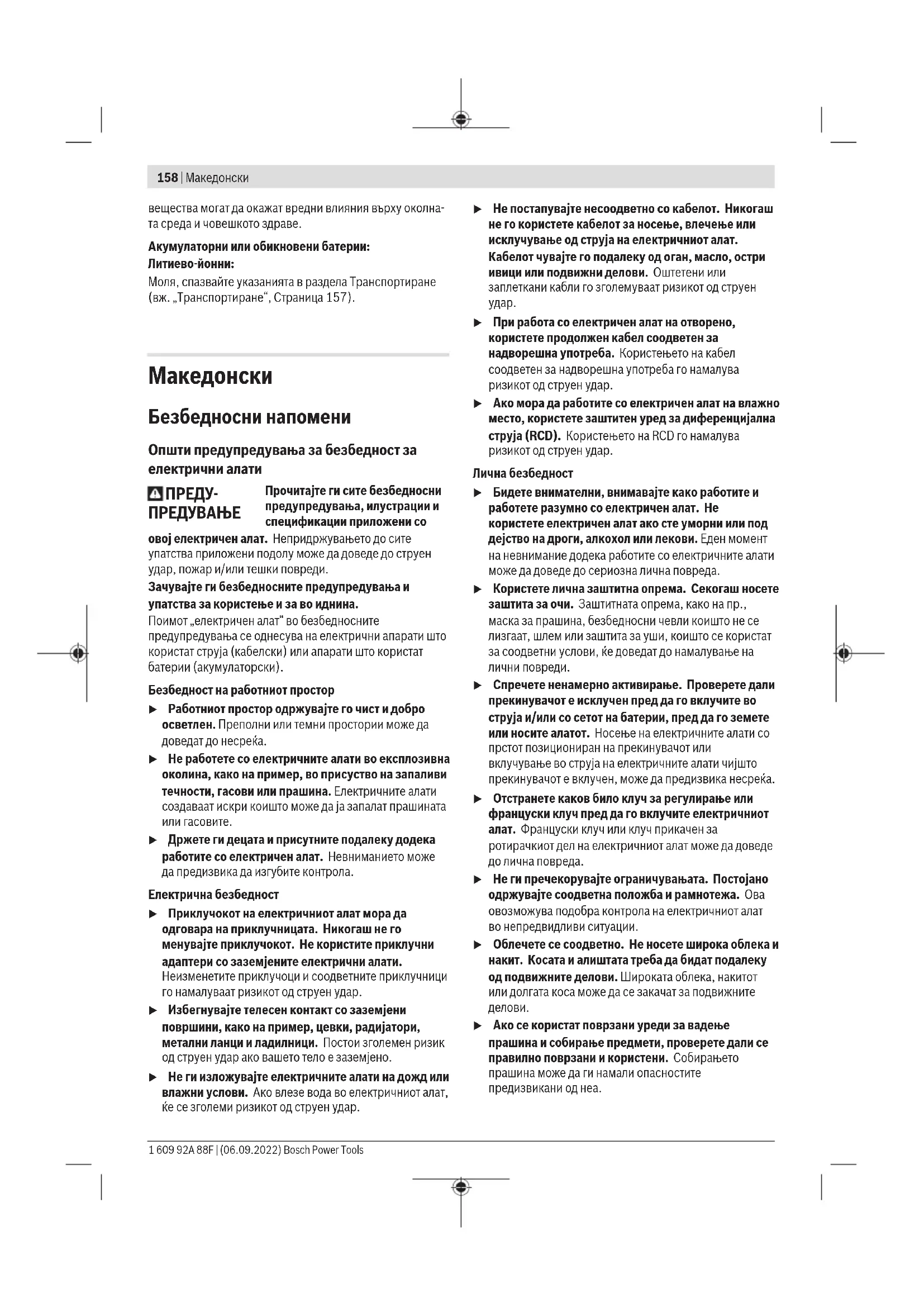 Препорачаните литиум-јонски батерии подлежат на барањата на Законот за опасни материјали. Батериите може да се транспортираат само од страна на корисникот, без потреба од дополнителни квалификации. При пренос на истите од страна на трети лица (на пр. воздушен транспорт или шпедиција) неопходно е да се внимава на специјалните напомени на амбалажата и ознаките. Во таков случај, при подготовката на пратката мора да се повика експерт за опасни супстанци. Транспортирајте ги батериите само доколку куќиштето е неоштетено. Залепете ги отворените контакти и спакувајте ја батеријата на тој начин што нема да се движи во амбалажата. Ве молиме внимавајте на евентуалните дополнителни национални прописи. Отстранување Електричните апарати, батериите, опремата и амбалажите треба да се отстранат на еколошки прифатлив начин. Не ги фрлајте електричните апарати и батериите во домашната канта за ѓубре! 1 609 92A 88F | (06.09.2022) Bosch Power ToolsSrpski | 165 Само за земјите од ЕУ: Според европската директива 2012/19/EU за стари електрични и електронски уреди и нивната употреба во националното законодавство, електричните алати што се вон употреба и дефектните или искористените батерии според директивата 2006/66/EC мора одделно да се соберат и да се рециклираат за повторна употреба. Доколку се отстрануваат неправилно, електричната и електронската опрема може да имаат штетни влијанија врз животната средина и здравјето на луѓето поради можното присуство на опасни материи.