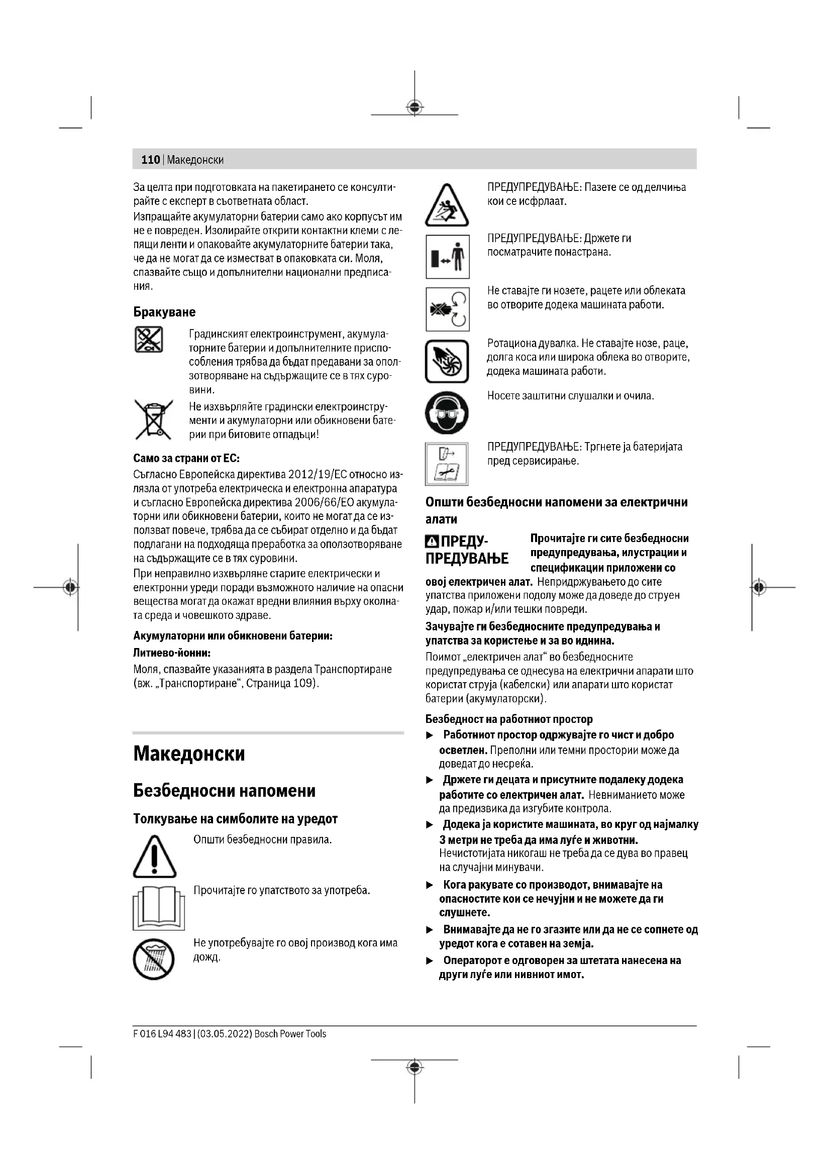 Препорачаните литиум-јонски батерии подлежат на барањата на Законот за опасни материјали. Батериите може да се транспортираат само од страна на корисникот, без потреба од дополнителни квалификации. При пренос на истите од страна на трети лица (на пр. воздушен транспорт или шпедиција) неопходно е да се внимава на специјалните напомени на амбалажата и ознаките. Во таков случај, при подготовката на пратката мора да се повика експерт за опасни супстанци. Транспортирајте ги батериите само доколку куќиштето е неоштетено. Залепете ги отворените контакти и спакувајте ја батеријата на тој начин што нема да се движи во амбалажата. Ве молиме внимавајте на евентуалните дополнителни национални прописи. Отстранување Електричните уреди, батериите, опремата и амбалажите треба да се сортираат за повторна употреба. Не фрлајте ги уредите и батериите во домашната канта за ѓубре! Само за земјите од ЕУ: Според европската регулатива 2012/19/EU електричните апарати што се вон употреба и дефектните или искористените батерии според регулативата F 016 L94 483 | (03.05.2022) Bosch Power ToolsSrpski | 115 2006/66/EC мора одделно да се соберат и да се рециклираат за повторна употреба. Доколку се отстрануваат неправилно, електричната и електронската опрема може да имаат штетни влијанија врз животната средина и здравјето на луѓето поради можното присуство на опасни материи.