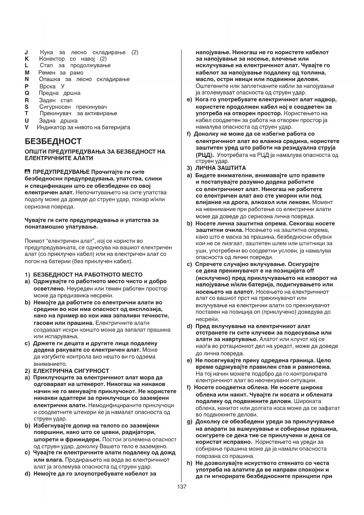 d) Пред вклучување на електричниот алат отстранете ги сите клучеви за подесување или алати за навртување. Алатот или клучот кој се наоѓа во ротациониот дел на уредот, може да доведе до лична повреда. e) Не посегнувајте преку одредена граница. Цело време одржувајте правилен став и рамнотежа. На тој начин можете подобро да го контролирате електричниот алат во неочекувани ситуации. f) Носете соодветна облека. Не носете широка облека или накит. Чувајте ги косата и облеката подалеку од подвижните делови. Широката облека, накитот или долгата коса може да се зафатат во подвижните делови. g) Доколку се обезбедени уреди за приклучување на апарати за вшмукување и собирање прашина, осигурете се дека тие се приклучени и дека се користат исправно. Користењето на уреди за собирање прашина може да ја намали опасноста поврзана со прашина. h) Не дозволувајте искуството стекнато со честа употреба на алатите да ве направи спокојни и да ги игнорирате безбедносните принципи при J Кука за лесно складирање (2) K Конектор со навој (2) L Стап за продолжување M Ремен за рамо N Опашка за лесно складирање P Врска У Q Предна дршка R Заден стап S Сигурносен прекинувач T Прекинувач за активирање U Задна дршка V Индикатор за нивото на батеријата