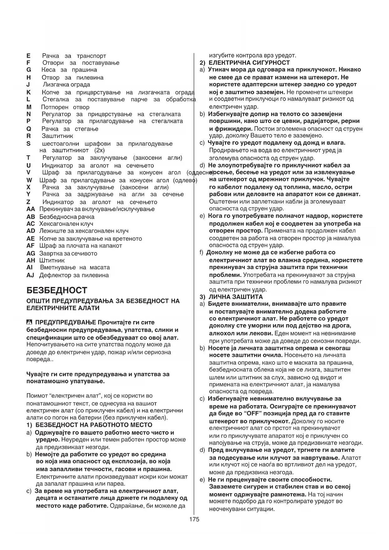 a) Бидете внимателни, внимавајте што правите и постапувајте внимателно додека работите со електричниот алат. Не работете со уредот доколку сте уморни или под дејство на дрога, алкохол или лекови. Еден момент на невнимание при употребата може да доведе до сеиозни повреди. b) Носете ја личната заштитна опрема и секогаш носете заштитни очила. Носењето на личната заштитна опрема, како што е маската за прашина, безбедносната облека која не се лизга, заштитен шлем или штитник за слух, зависно од видот и примената на електричниот алат, ја намалува опасноста од повреда. c) Избегнувајте невнимателно вклучување за време на работата. Осигурајте се прекинувачот да биде во “OFF” позиција пред да го ставите штекерот во приклучокот. Доколку го носите електричниот алат со прстот на прекинувачот или го приклучувате апаратот кој е приклучен со напојување на струја, може да предизвикате незгоди. d) Пред вклучување на уредот, тргнете ги алатите за подесување или клучот за навртување. Алатот или клучот кој се наоѓа во вртливиот дел на уредот, може да предизвика незгода. e) Не ги преценувајте своите способности. Завземете сигурен и стабилен став и во секој момент одржувајте рамнотежа. На тој начин можете подобро да го контролирате уредот во неочекувани ситуации. E Рачка за транспорт F Отвори за поставување G Кеса за прашина H Отвор за пилевина J Лизгачка ограда K Копче за прицврстување на лизгачката ограда L Стегалка за поставување парче за обработка M Потпорен отвор N Регулатор за прицврстување на стегалката P Регулатор за прилагодување на стегалката Q Рачка за стегање R Заштитник S шестоаголни шрафови за прилагодување на заштитникот (2x) T Регулатор за заклучување (закосени агли) U Индикатор за аголот на сечењето V Шраф за прилагодување за конусен агол (оддесно) W Шраф за прилагодување за конусен агол (одлево) X Рачка за заклучување (закосени агли) Y Рачка за задржување на агли за сечење Z Индикатор за аголот на сечењето AA Прекинувач за вклучување/исклучување AB Безбедносна рачка AC Хексагонален клуч AD Лежиште за хексагонален клуч AE Копче за заклучување на вретеното AF Шраф за плочата на капакот AG Завртка за сечивото AH Штитник AI Вметнување на масата AJ Дефлектор за пилевина