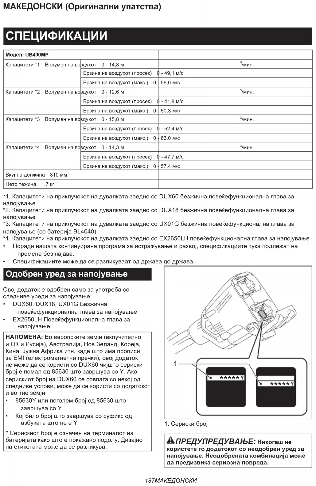 - IzvornaMakitabaterijaipunjač NAPOMENA: Neke stavke s popisa mogu se ispo- ručitizajednosproizvodomkaostandardnidodatni pribor.Onemogubitirazličiteovisnoozemlji.187 МАКЕДОНСКИ МАКЕДОНСКИ (Оригинални упатства) СПЕЦИФИКАЦИИ Модел: UB400MPКапацитети*1 Волуменнавоздухот 0-14,8м /мин.Брзинанавоздухот(просек) 0-49,1м/сБрзинанавоздухот(макс.) 0-59,0м/сКапацитети*2 Волуменнавоздухот 0-12,6м /мин.Брзинанавоздухот(просек) 0-41,8м/сБрзинанавоздухот(макс.) 0-50,3м/сКапацитети*3 Волуменнавоздухот 0-15,8м /мин.Брзинанавоздухот(просек) 0-52,4м/сБрзинанавоздухот(макс.) 0-63,0м/сКапацитети*4 Волуменнавоздухот 0-14,3м /мин.Брзинанавоздухот(просек) 0-47,7м/сБрзинанавоздухот(макс.) 0-57,4м/сВкупнадолжина 810ммНетотежина 1,7кг*1.КапацитетинаприклучокотнадувалкатазаедносоDUX60безжичнаповеќефункционалнаглавазанапојување*2.КапацитетинаприклучокотнадувалкатазаедносоDUX18безжичнаповеќефункционалнаглавазанапојување*3.КапацитетинаприклучокотнадувалкатазаедносоUX01Gбезжичнаповеќефункционалнаглавазанапојување(собатеријаBL4040)*4.КапацитетинаприклучокотнадувалкатазаедносоEX2650LHповеќефункционалнаглавазанапојување• Порадинашатаконтинуиранапрограмазаистражувањеиразвој,спецификациитетукаподлежатнапроменабезнајава.• Спецификациитеможедасеразликуваатоддржавадодржава. Одобрен уред за напојување Овојдодатокеодобренсамозаупотребасоследнивеуредизанапојување:• DUX60,DUX18,UX01GБезжичнаповеќефункционалнаглавазанапојување• EX2650LHПовеќефункционалнаглавазанапојувањеНАПОМЕНА:Воевропскитеземји(вклучителноиОКиРусија),Австралија,НовЗеланд,Кореја,Кина,ЈужнаАфрикаитн.кадештоимапрописизаEMI(електромагнетнипречки),овојдодатокнеможедасекористисоDUX60чијштосерискибројепомалод85630штозавршувасоY.АкосерискиотбројнаDUX60сесовпаѓасонекојодследнивеуслови,можедасекористисододатокотивотиеземји:• 85630Yилипоголембројод85630штозавршувасоY• КојбилобројштозавршувасосуфиксодазбукаташтонееY*Серискиотбројеозначеннатерминалотнабатеријатакакоштоепокажаноподолу.Дизајнотнаетикетатаможедасеразликува.