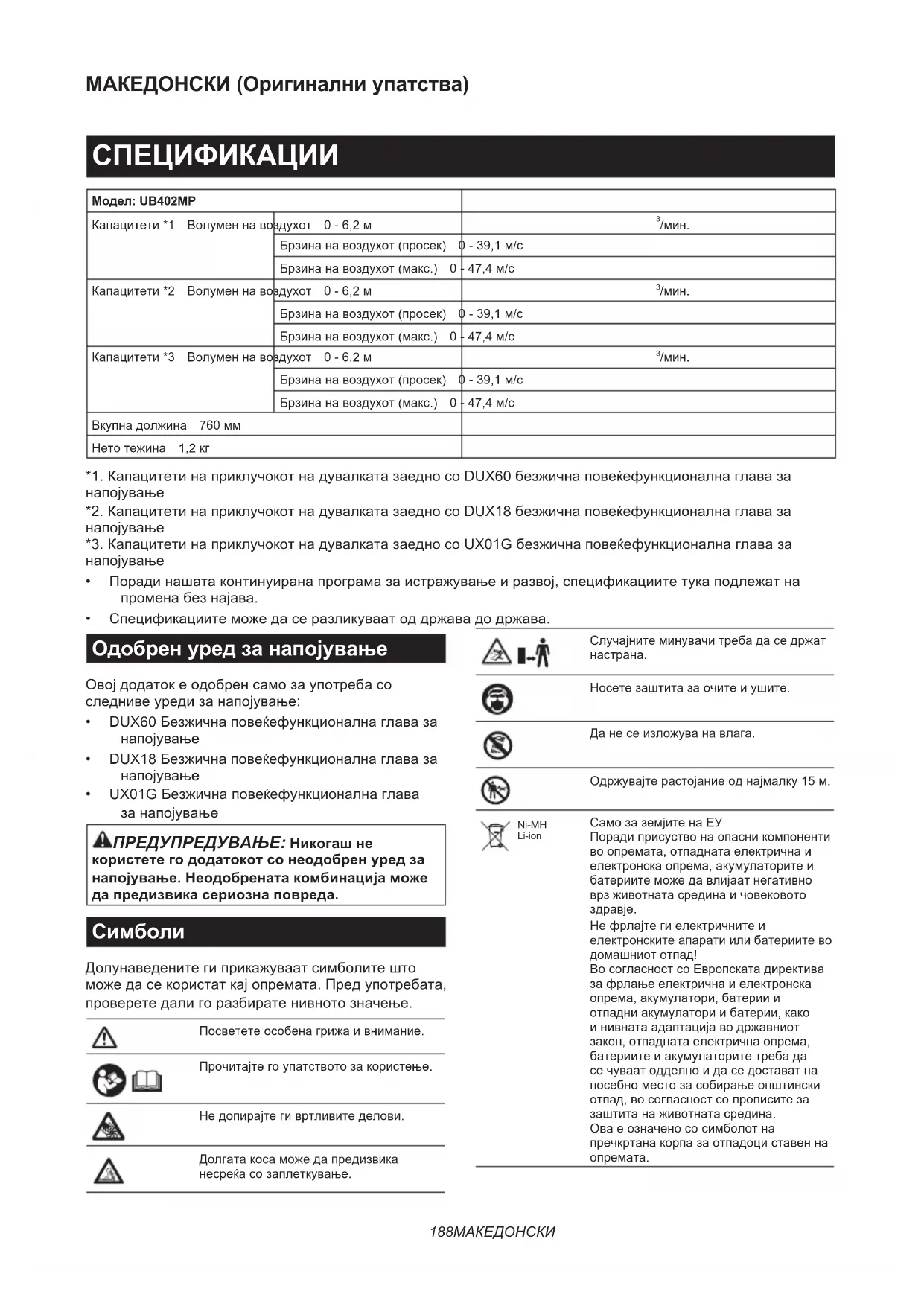 Нефрлајтегиелектричнитеи електронскитеапаратиилибатериитево домашниототпад! ВосогласностсоЕвропскатадиректива зафрлањеелектричнаиелектронска опрема,акумулатори,батериии отпадниакумулаториибатерии,како инивнатаадаптацијаводржавниот закон,отпаднатаелектричнаопрема, батериитеиакумулаторитетребада сечуваатодделноидаседоставатна посебноместозасобирањеопштински отпад,восогласностсопрописитеза заштитанаживотнатасредина. Оваеозначенососимболотна пречкртанакорпазаотпадоциставенна опремата.189 МАКЕДОНСКИ Наменета употреба Додатокотепредвиденсамозадувањеправ, заедносоодобренуредзанапојување.Никогаш некористетегододатокотзадругинамени.Со неправилнаупотребанадодатокотможеда предизвикатесериознаповреда. Декларација за сообразност од ЕУ Само за земјите во Европа Ниекакопроизводители:Makita Europe N.V., деловнаадреса:Jan-Baptist Vinkstraat 2 3070 Kortenberg BELGIUM.гоовластувамеHiroshi Tsujimuraзасоставувањенатехничкиотдокументи сонашацелосналичнаодговорностизјавувамедека производите; Ознака:Приклучок на дувалката.Ознакана типовите:UB402MP. гиисполнуваатситерелевантниодредбиод 2006/42/ECиистотакагиисполнуваатрелевантните одредбиодследнивеДирективинаЕЗ/ЕУ:2000/14/ ECисепроизведенивосогласностсоследниве хармонизиранистандарди:EN 60335-1:2012+A11 :2014+A13:2017+A1:2019+A14:2019+A2:2019, EN 50636-2-100:2014. Местоидатумнаизјавата:Контенберг, Белгија.