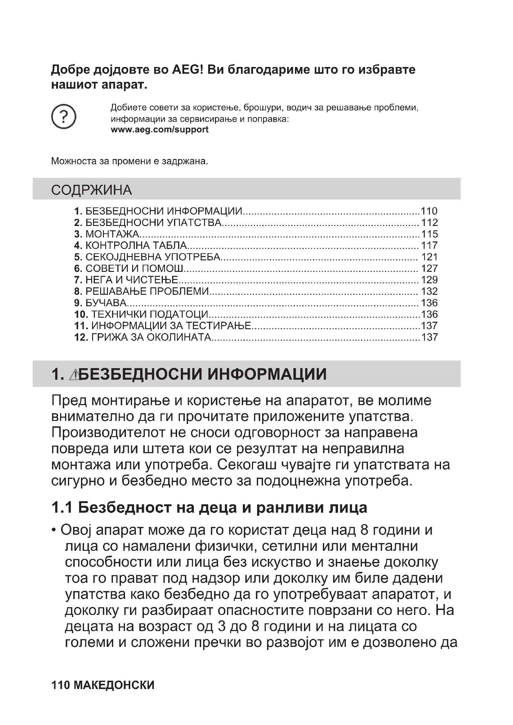 - Овој апарат може да го користат деца над 8 години и лица со намалени физички, сетилни или ментални способности или лица без искуство и знаење доколку тоа го прават под надзор или доколку им биле дадени упатства како безбедно да го употребуваат апаратот, и доколку ги разбираат опасностите поврзани со него. На децата на возраст од 3 до 8 години и на лицата со големи и сложени пречки во развојот им е дозволено да 110 МАКЕДОНСКИго полнат и да го празнат апаратот доколку добиле соодветни упатства. Апаратот не смее да биде во дофат на деца помали од 3 години освен ако не се под постојан надзор.